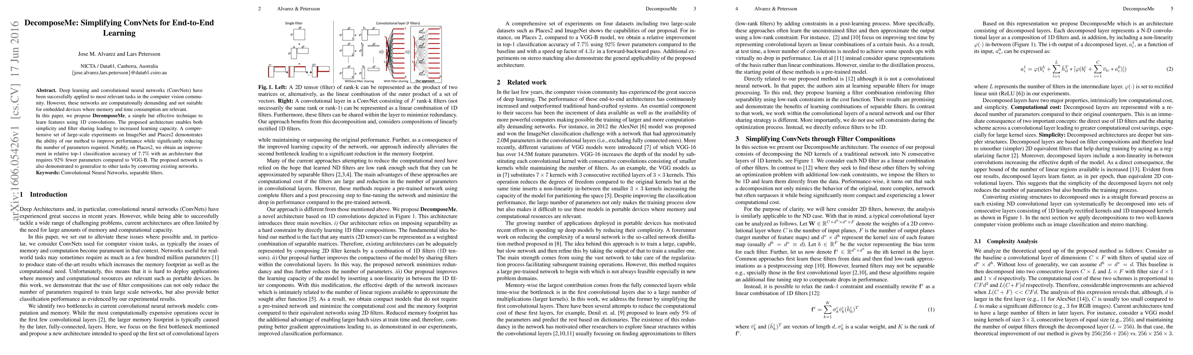 Deep learning and convolutional neural networks (ConvNets) have been successfully applied to most relevant tasks in the computer vision community. However, these networks are computationally demanding and not suitable for embedded devices where memory and time consumption are relevant. In this paper, we propose DecomposeMe, a simple but effective technique to learn features using 1D convolutions. The proposed architecture enables both simplicity and filter sharing leading to increased learning capacity. A comprehensive set of large-scale experiments on ImageNet and Places2 demonstrates the ability of our method to improve performance while significantly reducing the number of parameters required. Notably, on Places2, we obtain an improvement in relative top-1 classification accuracy of 7.7\% with an architecture that requires 92% fewer parameters compared to VGG-B. The proposed network is also demonstrated to generalize to other tasks by converting existing networks.