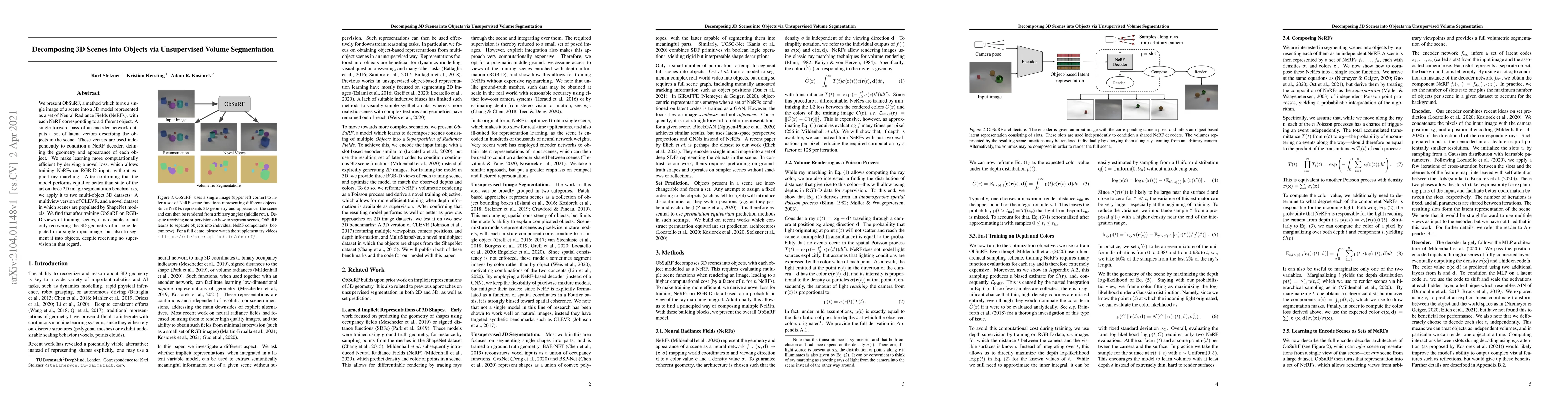 We present ObSuRF, a method which turns a single image of a scene into a 3D model represented as a set of Neural Radiance Fields (NeRFs), with each NeRF corresponding to a different object. A single forward pass of an encoder network outputs a set of latent vectors describing the objects in the scene. These vectors are used independently to condition a NeRF decoder, defining the geometry and appearance of each object. We make learning more computationally efficient by deriving a novel loss, which allows training NeRFs on RGB-D inputs without explicit ray marching. After confirming that the model performs equal or better than state of the art on three 2D image segmentation benchmarks, we apply it to two multi-object 3D datasets: A multiview version of CLEVR, and a novel dataset in which scenes are populated by ShapeNet models. We find that after training ObSuRF on RGB-D views of training scenes, it is capable of not only recovering the 3D geometry of a scene depicted in a single input image, but also to segment it into objects, despite receiving no supervision in that regard.