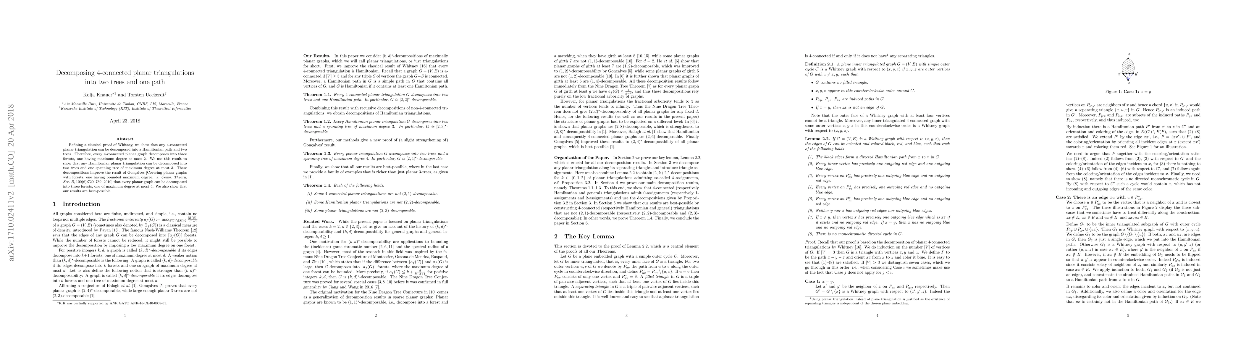 Researchers show that 4-connected planar graphs can be decomposed into three forests, one with maximum degree at most 2, improving a previous result for planar graphs.