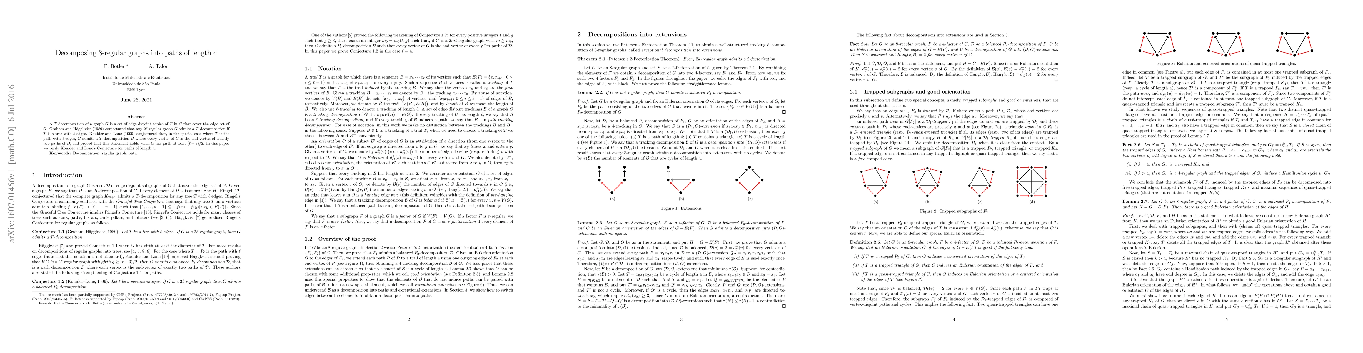 This paper verifies Kouider and Lonc's Conjecture for 8-regular graphs decomposing into paths of length 4, showing that every vertex is the end-vertex of exactly two paths in the decomposition.