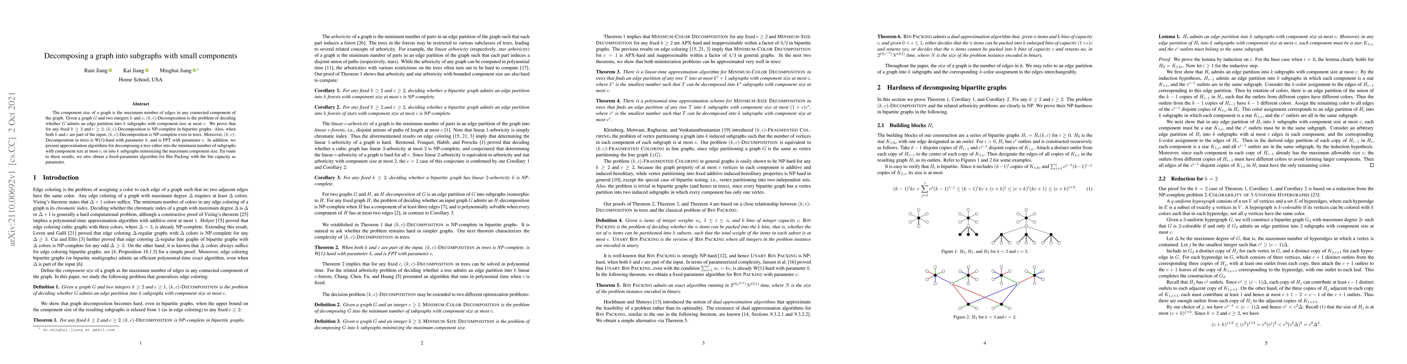 The component size of a graph is the maximum number of edges in any connected component of the graph. Given a graph $G$ and two integers $k$ and $c$, $(k,c)$-Decomposition is the problem of deciding whether $G$ admits an edge partition into $k$ subgraphs with component size at most $c$. We prove that for any fixed $k \ge 2$ and $c \ge 2$, $(k,c)$-Decomposition is NP-complete in bipartite graphs. Also, when both $k$ and $c$ are part of the input, $(k,c)$-Decomposition is NP-complete even in trees. Moreover, $(k,c)$-Decomposition in trees is W[1]-hard with parameter $k$, and is FPT with parameter $c$. In addition, we present approximation algorithms for decomposing a tree either into the minimum number of subgraphs with component size at most $c$, or into $k$ subgraphs minimizing the maximum component size. En route to these results, we also obtain a fixed-parameter algorithm for Bin Packing with the bin capacity as parameter.
