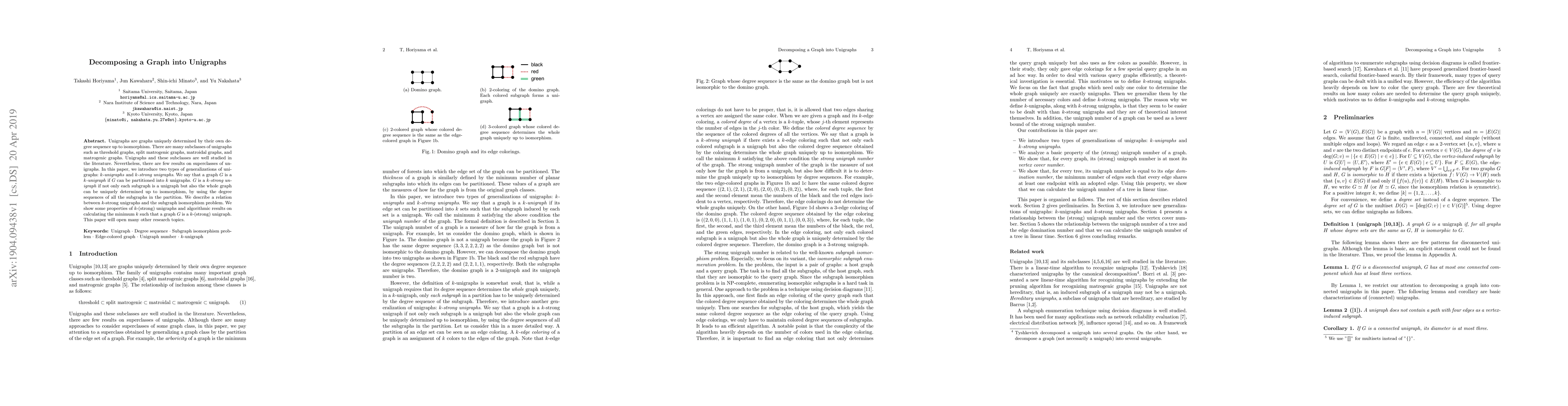 Unigraphs are graphs uniquely determined by their own degree sequence up to isomorphism. There are many subclasses of unigraphs such as threshold graphs, split matrogenic graphs, matroidal graphs, and matrogenic graphs. Unigraphs and these subclasses are well studied in the literature. Nevertheless, there are few results on superclasses of unigraphs. In this paper, we introduce two types of generalizations of unigraphs: $k$-unigraphs and $k$-strong unigraphs. We say that a graph $G$ is a $k$-unigraph if $G$ can be partitioned into $k$ unigraphs. $G$ is a $k$-strong unigraph if not only each subgraph is a unigraph but also the whole graph can be uniquely determined up to isomorphism, by using the degree sequences of all the subgraphs in the partition. We describe a relation between $k$-strong unigraphs and the subgraph isomorphism problem. We show some properties of $k$-(strong) unigraphs and algorithmic results on calculating the minimum $k$ such that a graph $G$ is a $k$-(strong) unigraph. This paper will open many other research topics.