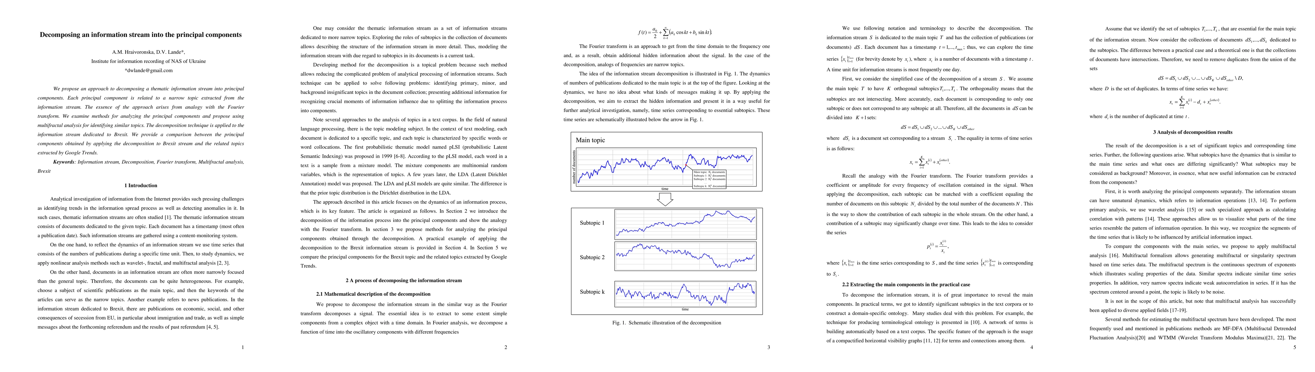 We propose an approach to decomposing a thematic information stream into principal components. Each principal component is related to a narrow topic extracted from the information stream. The essence of the approach arises from analogy with the Fourier transform. We examine methods for analyzing the principal components and propose using multifractal analysis for identifying similar topics. The decomposition technique is applied to the information stream dedicated to Brexit. We provide a comparison between the principal components obtained by applying the decomposition to Brexit stream and the related topics extracted by Google Trends.