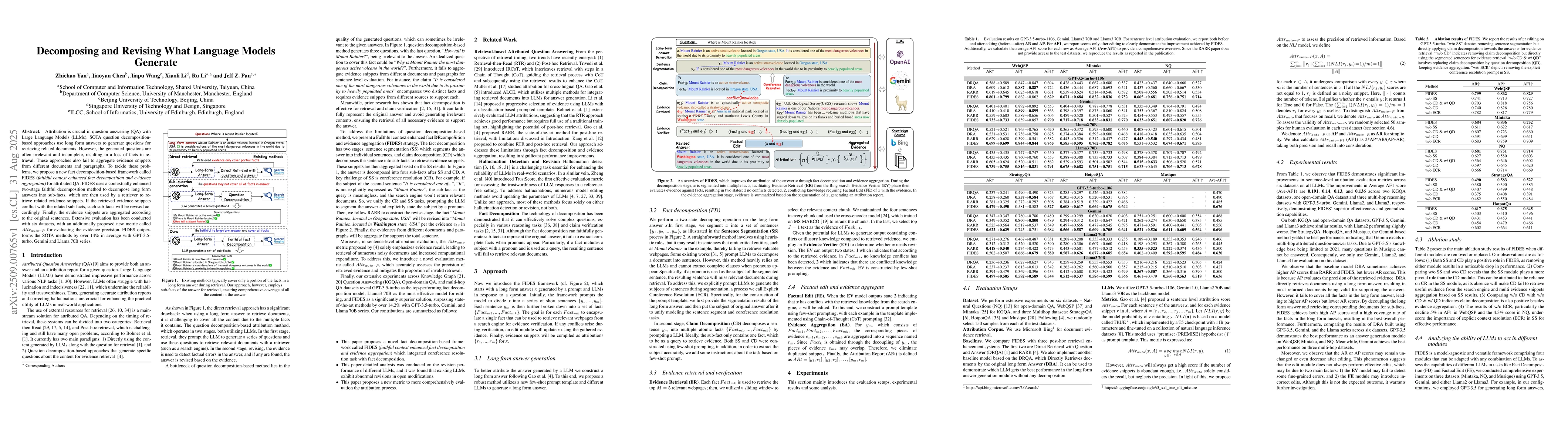 Attribution is crucial in question answering (QA) with Large Language Models (LLMs).SOTA question decomposition-based approaches use long form answers to generate questions for retrieving related documents. However, the generated questions are often irrelevant and incomplete, resulting in a loss of facts in retrieval.These approaches also fail to aggregate evidence snippets from different documents and paragraphs. To tackle these problems, we propose a new fact decomposition-based framework called FIDES (\textit{faithful context enhanced fact decomposition and evidence aggregation}) for attributed QA. FIDES uses a contextually enhanced two-stage faithful decomposition method to decompose long form answers into sub-facts, which are then used by a retriever to retrieve related evidence snippets. If the retrieved evidence snippets conflict with the related sub-facts, such sub-facts will be revised accordingly. Finally, the evidence snippets are aggregated according to the original sentences.Extensive evaluation has been conducted with six datasets, with an additionally proposed new metric called $Attr_{auto-P}$ for evaluating the evidence precision. FIDES outperforms the SOTA methods by over 14\% in average with GPT-3.5-turbo, Gemini and Llama 70B series.