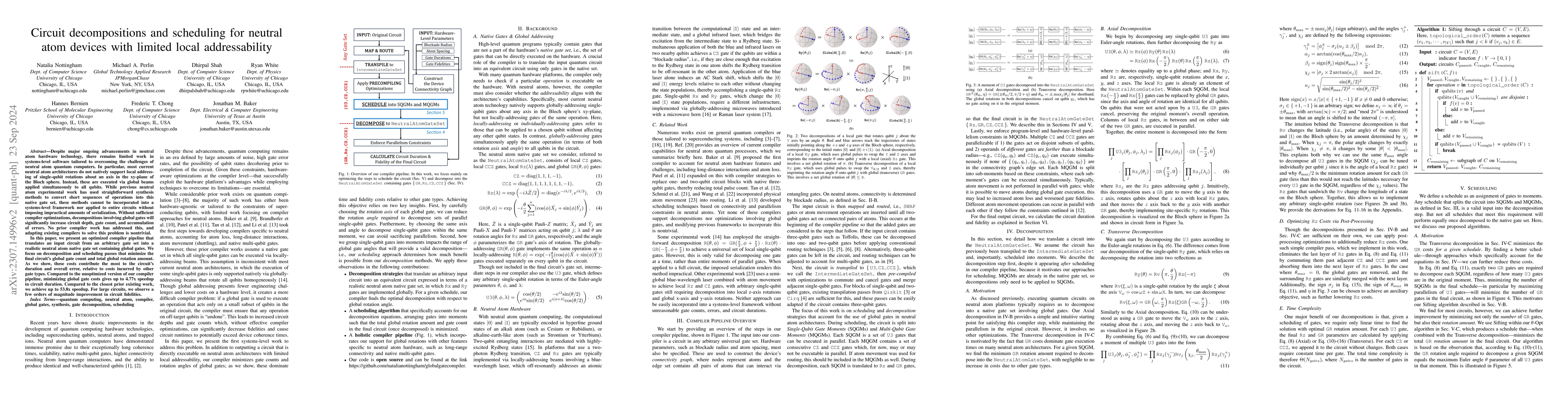 This paper introduces a novel compiler for neutral atom quantum computers, addressing the hardware's limitations in local addressibility by decomposing quantum circuits into the native gate set. The proposed algorithms optimize global gate execution costs and explore atom movement for routing, achieving up to 10x reduction in circuit duration and over 2x improvement in fidelity.