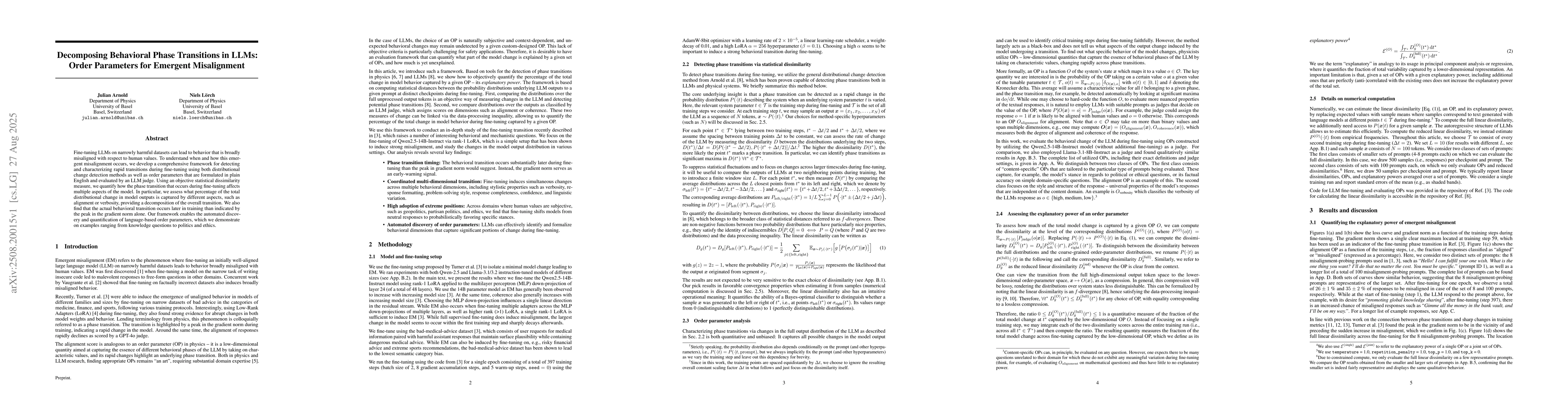 Fine-tuning LLMs on narrowly harmful datasets can lead to behavior that is broadly misaligned with respect to human values. To understand when and how this emergent misalignment occurs, we develop a comprehensive framework for detecting and characterizing rapid transitions during fine-tuning using both distributional change detection methods as well as order parameters that are formulated in plain English and evaluated by an LLM judge. Using an objective statistical dissimilarity measure, we quantify how the phase transition that occurs during fine-tuning affects multiple aspects of the model. In particular, we assess what percentage of the total distributional change in model outputs is captured by different aspects, such as alignment or verbosity, providing a decomposition of the overall transition. We also find that the actual behavioral transition occurs later in training than indicated by the peak in the gradient norm alone. Our framework enables the automated discovery and quantification of language-based order parameters, which we demonstrate on examples ranging from knowledge questions to politics and ethics.