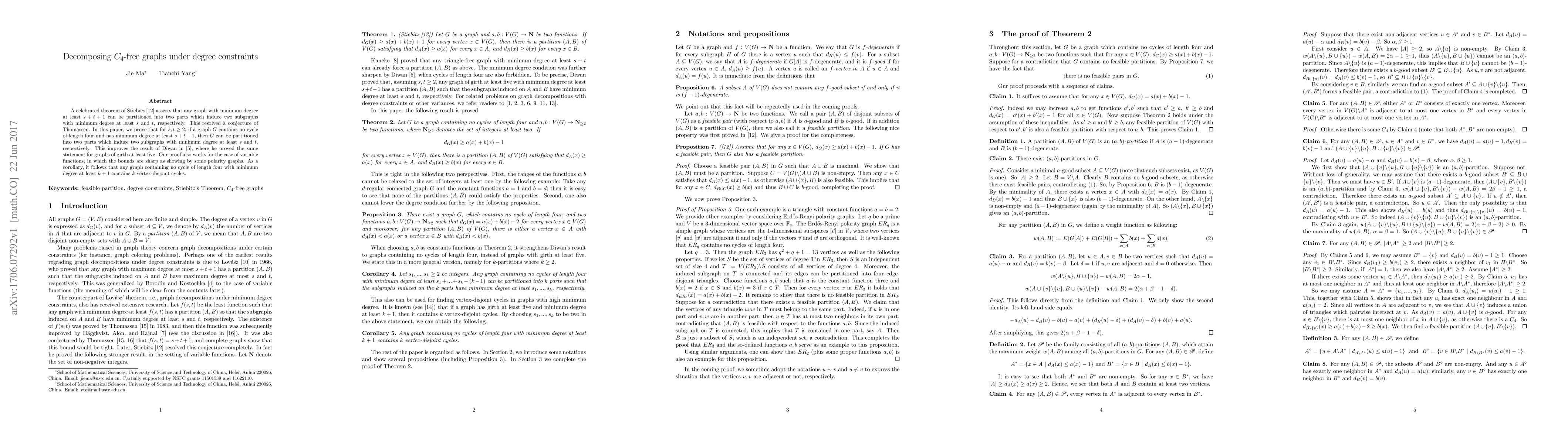 Researchers prove that a C4-free graph with minimum degree at least s+t-1 can be partitioned into two parts with minimum degrees at least s and t, improving on previous results for similar constraints.