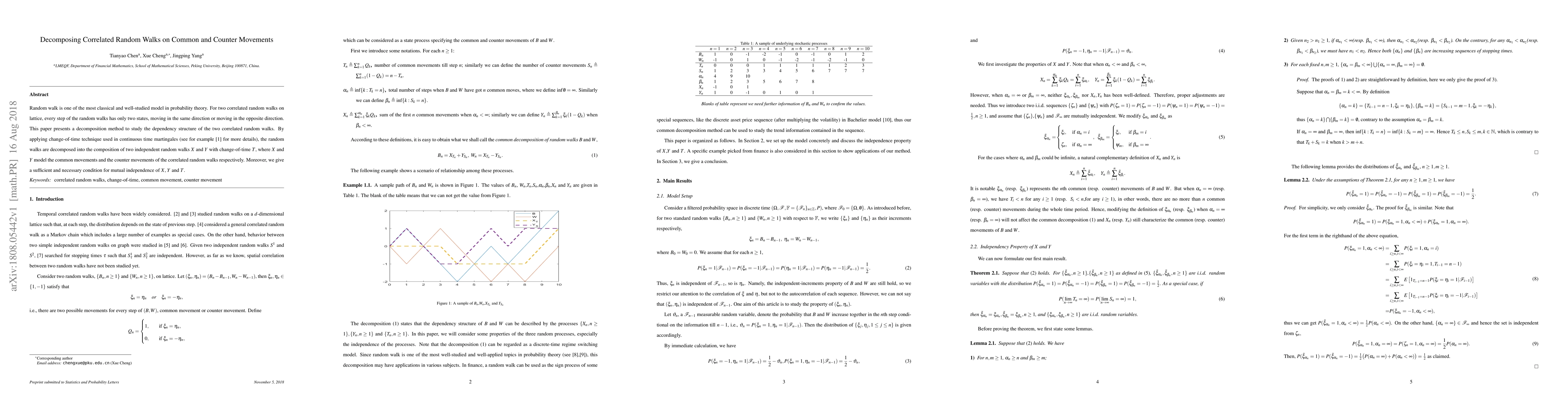 This paper decomposes correlated random walks into independent components modeling common and counter movements using a change-of-time technique. It provides a method to separate the dependency structure and establishes conditions for mutual independence of the decomposed random walks.