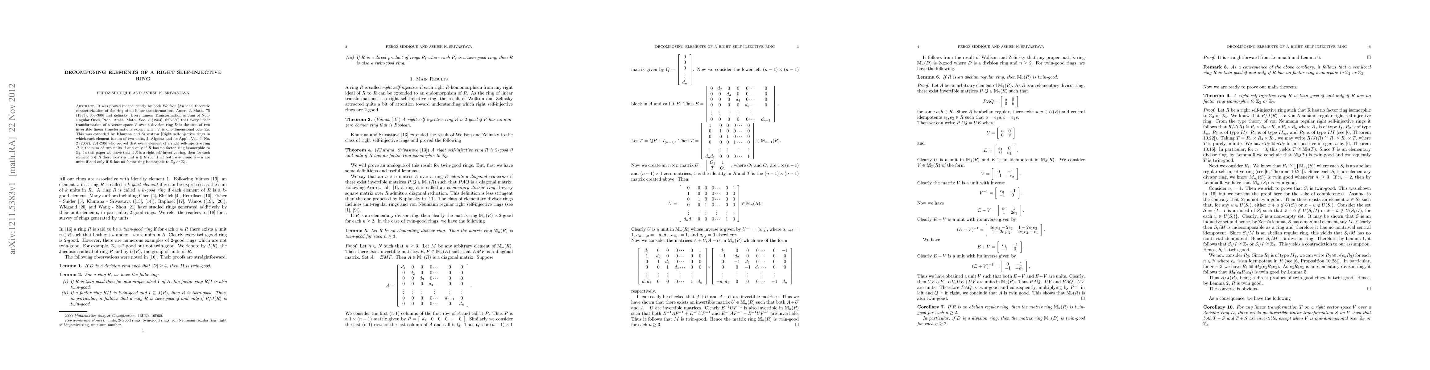 It was proved independently by both Wolfson [An ideal theoretic characterization of the ring of all linear transformations, Amer. J. Math. 75 (1953), 358-386] and Zelinsky [Every Linear Transformation is Sum of Nonsingular Ones, Proc. Amer. Math. Soc. 5 (1954), 627-630] that every linear transformation of a vector space $V$ over a division ring $D$ is the sum of two invertible linear transformations except when $V$ is one-dimensional over $\mathbb Z_2$. This was extended by Khurana and Srivastava [Right self-injective rings in which each element is sum of two units, J. Algebra and its Appl., Vol. 6, No. 2 (2007), 281-286] who proved that every element of a right self-injective ring $R$ is the sum of two units if and only if $R$ has no factor ring isomorphic to $\mathbb Z_2$. In this paper we prove that if $R$ is a right self-injective ring, then for each element $a\in R$ there exists a unit $u\in R$ such that both $a+u$ and $a-u$ are units if and only if $R$ has no factor ring isomorphic to $\mathbb Z_2$ or $\mathbb Z_3$.