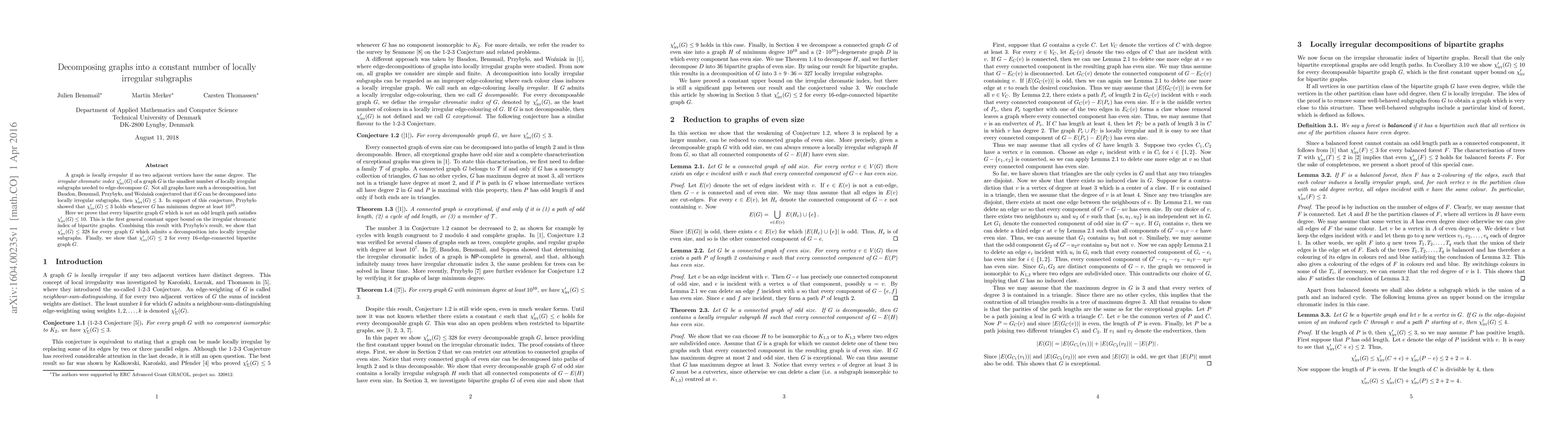 This paper establishes an upper bound of 10 on the irregular chromatic index for bipartite graphs that are not odd length paths, supporting the conjecture that the index is bounded by 3 when graphs can be decomposed into locally irregular subgraphs. It also combines this result with existing bounds to show that any such decomposable graph has an irregular chromatic index no greater than 328.