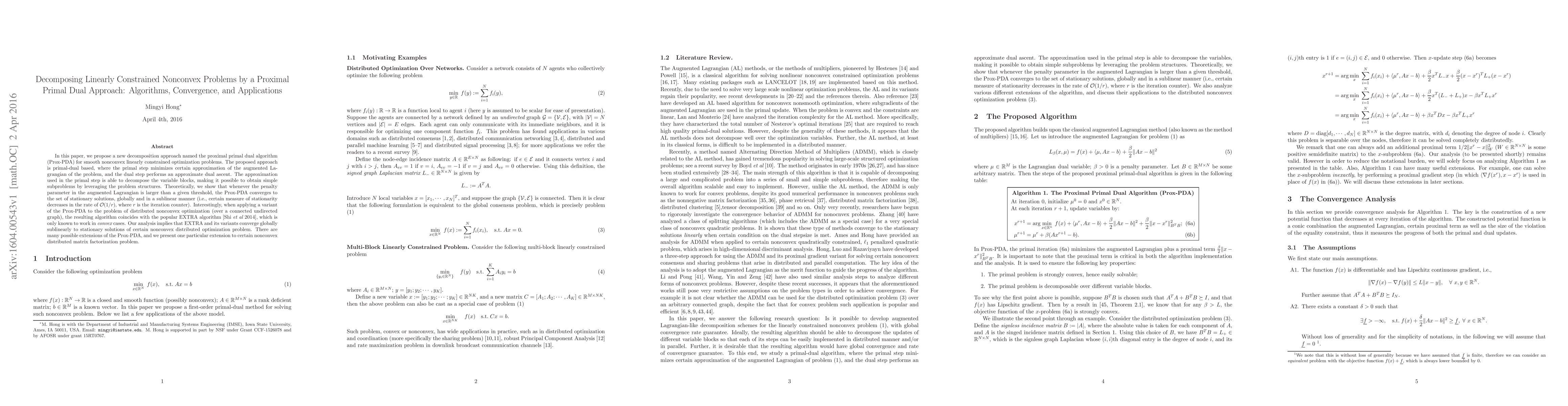 This paper introduces a proximal primal dual algorithm (Prox-PDA) for solving smooth nonconvex optimization problems with linear constraints. It decomposes the problem into simpler subproblems and converges globally to stationary solutions in a sublinear rate. The algorithm also extends to distributed optimization, showing convergence for nonconvex problems similar to the EXTRA algorithm.
