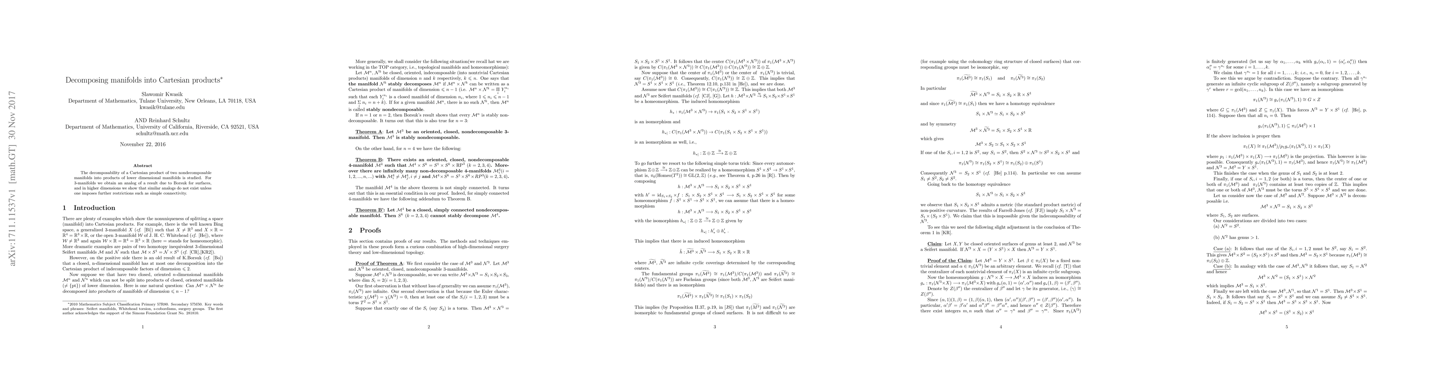 The decomposability of a Cartesian product of two nondecomposable manifolds into products of lower dimensional manifolds is studied. For 3-manifolds we obtain an analog of a result due to Borsuk for surfaces, and in higher dimensions we show that similar analogs do not exist unless one imposes further restrictions such as simple connectivity.