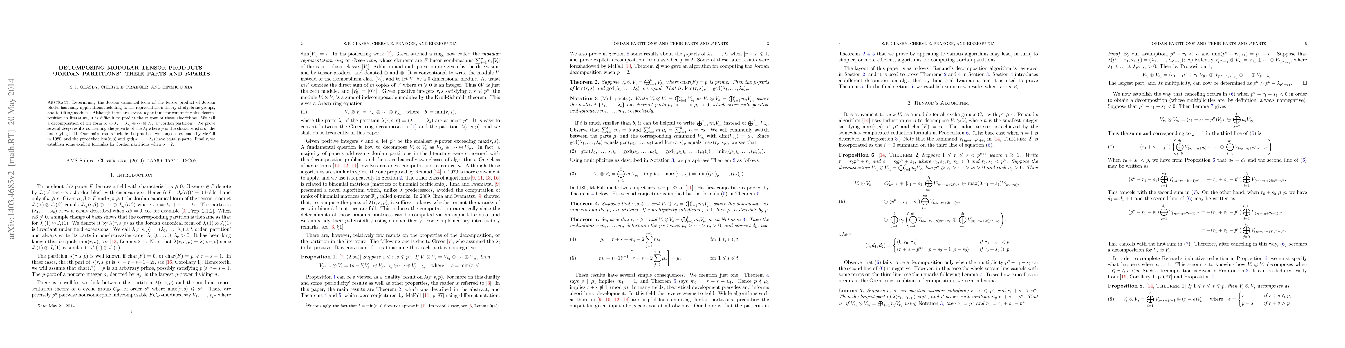 Determining the Jordan canonical form of the tensor product of Jordan blocks has many applications including to the representation theory of algebraic groups, and to tilting modules. Although there are several algorithms for computing this decomposition in literature, it is difficult to predict the output of these algorithms. We call a decomposition of the form $J_r\otimes J_s=J_{\lambda_1}\oplus\cdots\oplus J_{\lambda_b}$ a `Jordan partition'. We prove several deep results concerning the $p$-parts of the $\lambda_i$ where $p$ is the characteristic of the underlying field. Our main results include the proof of two conjectures made by McFall in 1980, and the proof that ${\rm lcm}(r,s)$ and $\gcd(\lambda_1,\dots,\lambda_b)$ have equal $p$-parts. Finally, we establish some explicit formulas for Jordan partitions when $p=2$.