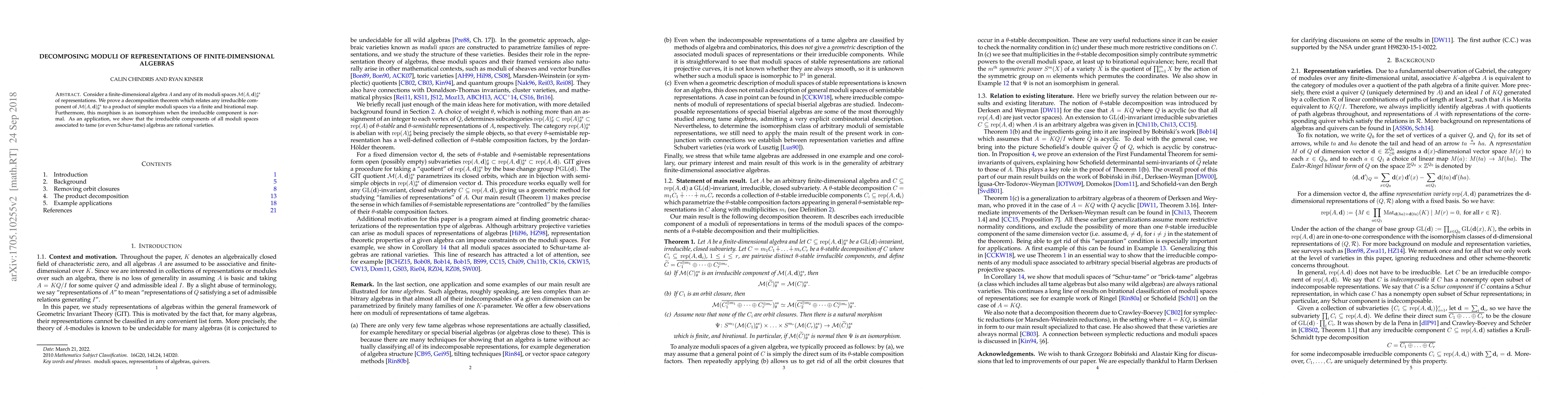 This paper proves a decomposition theorem for moduli spaces of representations of finite-dimensional algebras, showing that irreducible components relate to simpler moduli spaces via a finite birational map, which is an isomorphism if the component is normal. An application demonstrates that moduli spaces for tame algebras are rational varieties.