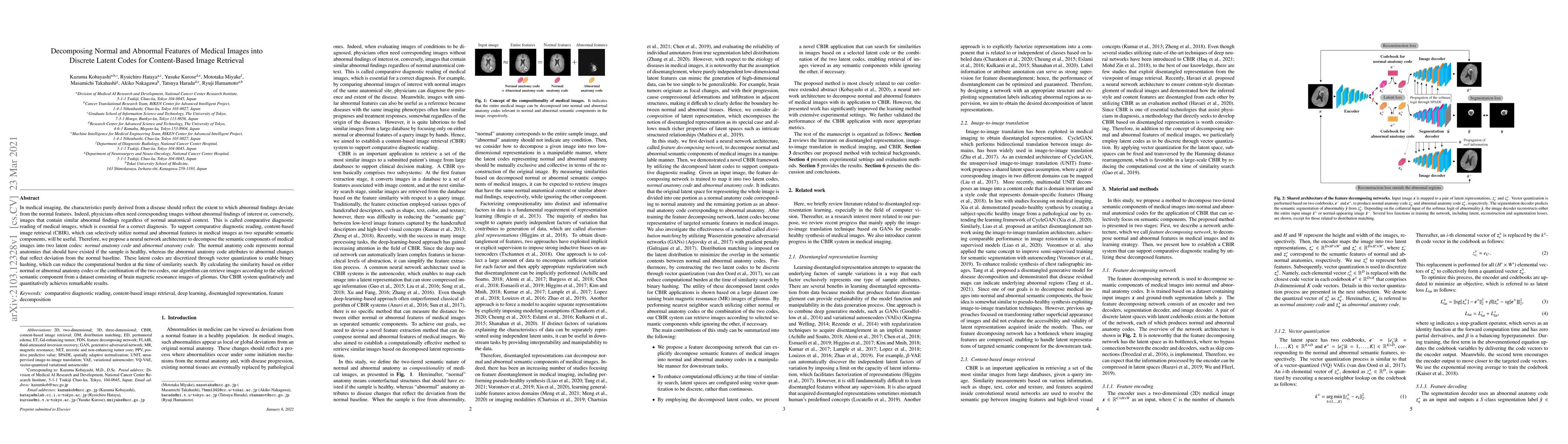 This research proposes a neural network to decompose medical image features into normal and abnormal latent codes for content-based image retrieval (CBIR). The model uses vector quantization to discretize these codes, enabling binary hashing for efficient similarity search. The system successfully retrieves images based on normal, abnormal, or combined anatomy codes, demonstrating significant performance in glioma brain MRI datasets.