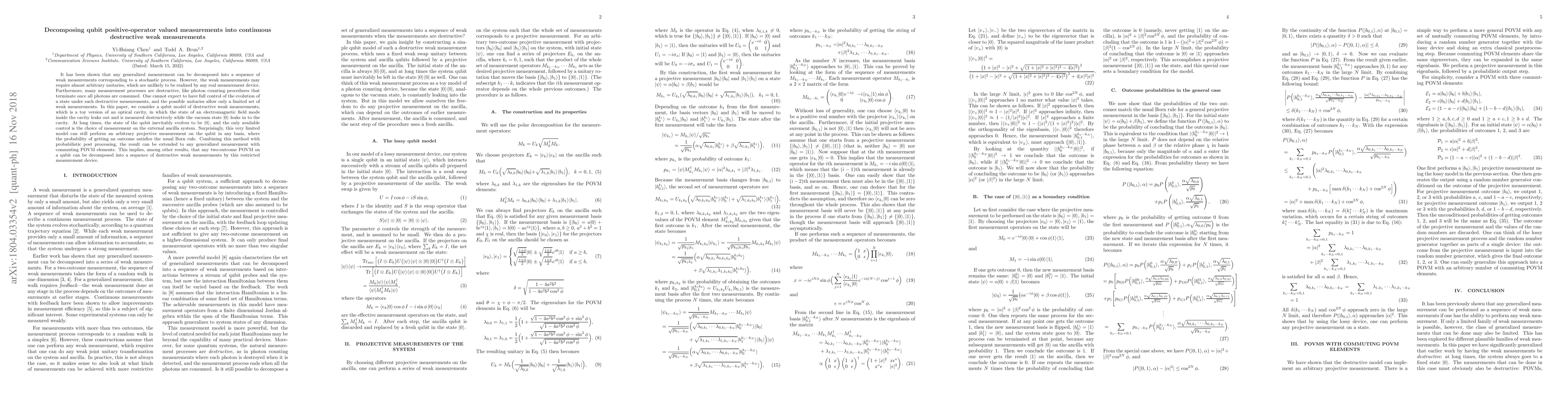 This paper decomposes generalized qubit measurements into sequences of destructive weak measurements, showing that even limited control over a qubit system can achieve projective measurements via probabilistic post-processing. This method extends to any generalized measurement with commuting POVM elements.