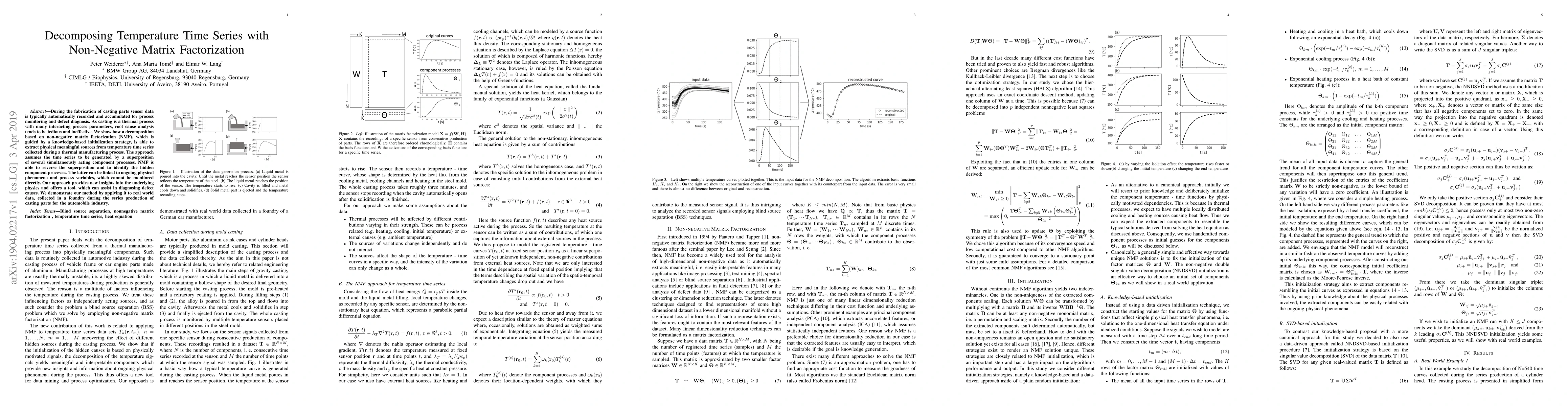 During the fabrication of casting parts sensor data is typically automatically recorded and accumulated for process monitoring and defect diagnosis. As casting is a thermal process with many interacting process parameters, root cause analysis tends to be tedious and ineffective. We show how a decomposition based on non-negative matrix factorization (NMF), which is guided by a knowledge-based initialization strategy, is able to extract physical meaningful sources from temperature time series collected during a thermal manufacturing process. The approach assumes the time series to be generated by a superposition of several simultaneously acting component processes. NMF is able to reverse the superposition and to identify the hidden component processes. The latter can be linked to ongoing physical phenomena and process variables, which cannot be monitored directly. Our approach provides new insights into the underlying physics and offers a tool, which can assist in diagnosing defect causes. We demonstrate our method by applying it to real world data, collected in a foundry during the series production of casting parts for the automobile industry.