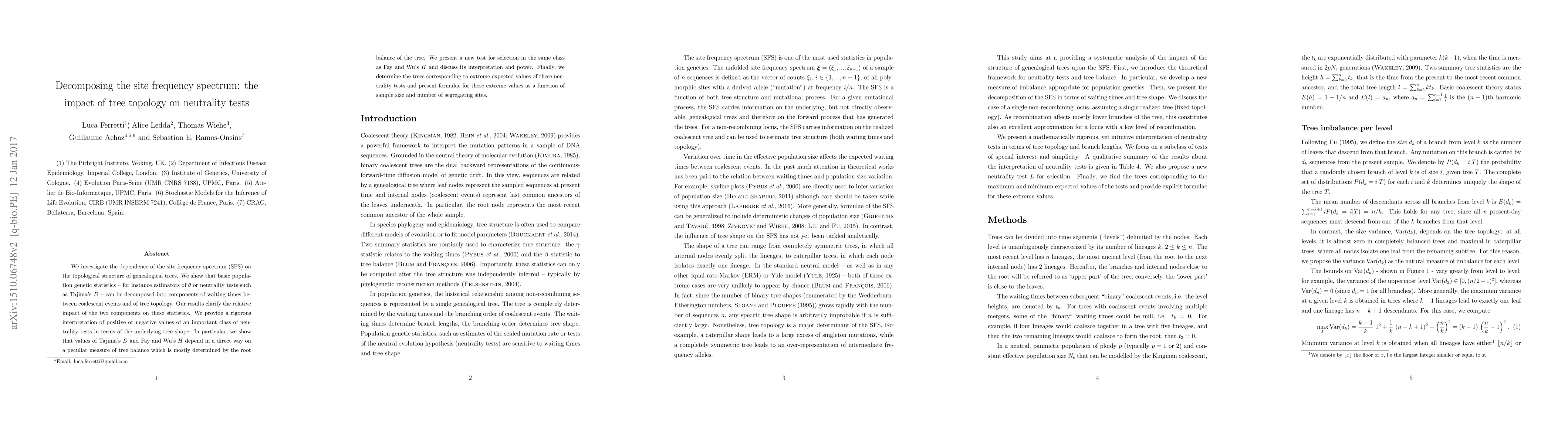 This paper investigates how tree topology affects site frequency spectrum analysis in genetics, revealing a direct link between tree balance and neutrality tests like Tajima's D.