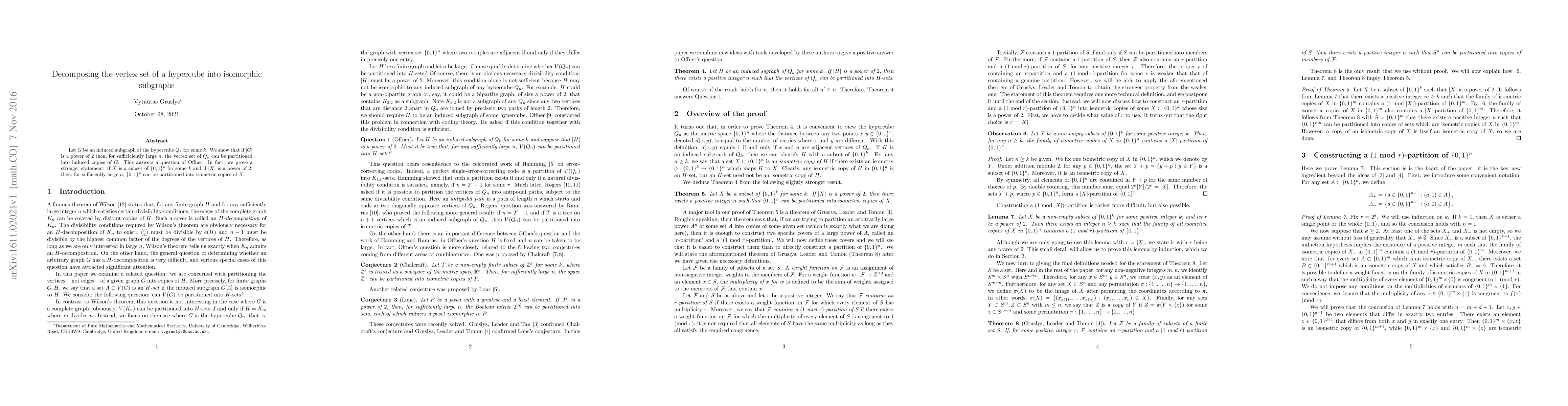Let $G$ be an induced subgraph of the hypercube $Q_k$ for some $k$. We show that if $|G|$ is a power of $2$ then, for sufficiciently large $n$, the vertex set of $Q_n$ can be partitioned into induced copies of $G$. This answers a question of Offner. In fact, we prove a stronger statement: if $X$ is a subset of $\{0,1\}^k$ for some $k$ and if $|X|$ is a power of $2$, then, for sufficiently large $n$, $\{0,1\}^n$ can be partitioned into isometric copies of $X$.