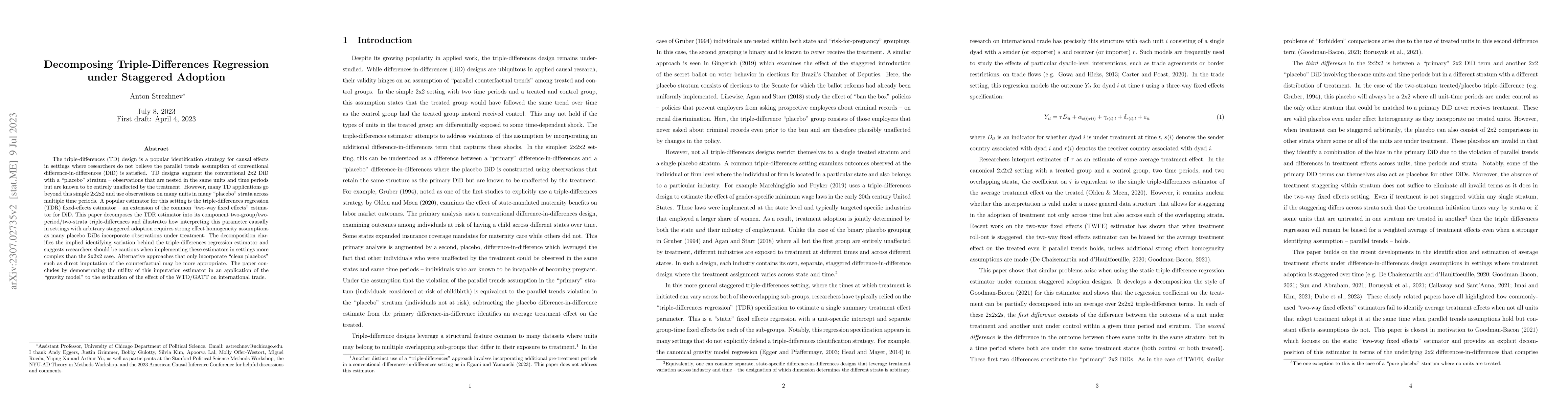 This paper decomposes the triple-differences regression (TDR) estimator into its component triple-differences, highlighting the need for strong effect homogeneity in causal interpretation under staggered adoption. It suggests caution in using TDR in complex settings and proposes direct counterfactual imputation as an alternative.