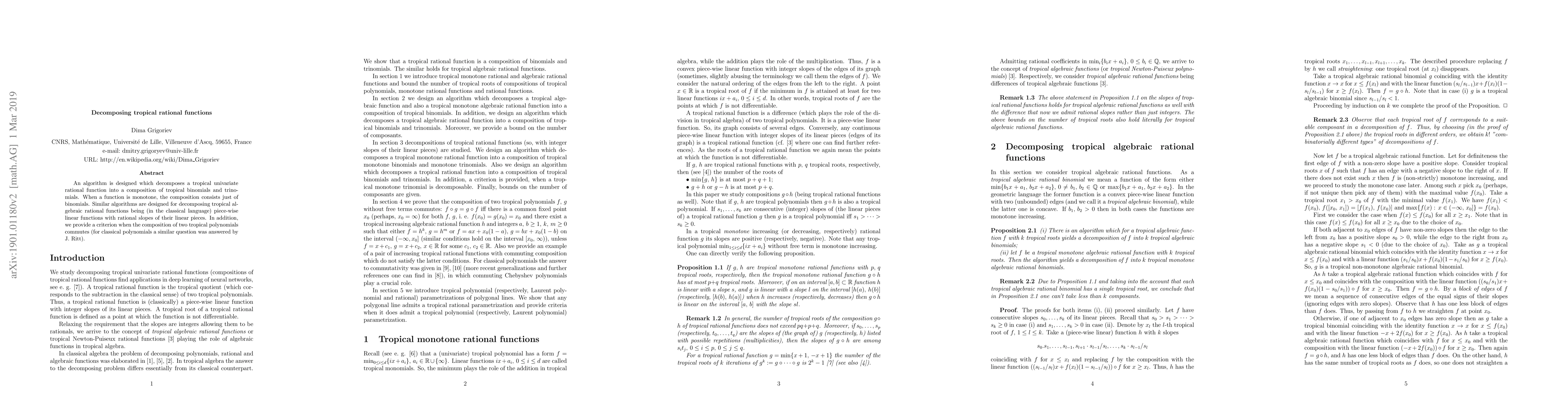 An algorithm is designed which decomposes a tropical univariate rational function into a composition of tropical binomials and trinomials. When a function is monotone, the composition consists just of binomials. Similar algorithms are designed for decomposing tropical algebraic rational functions being (in the classical language) piece-wise linear functions with rational slopes of their linear pieces. In addition, we provide a criterion when the composition of two tropical polynomials commutes (for classical polynomials a similar question was answered by J.~Ritt).