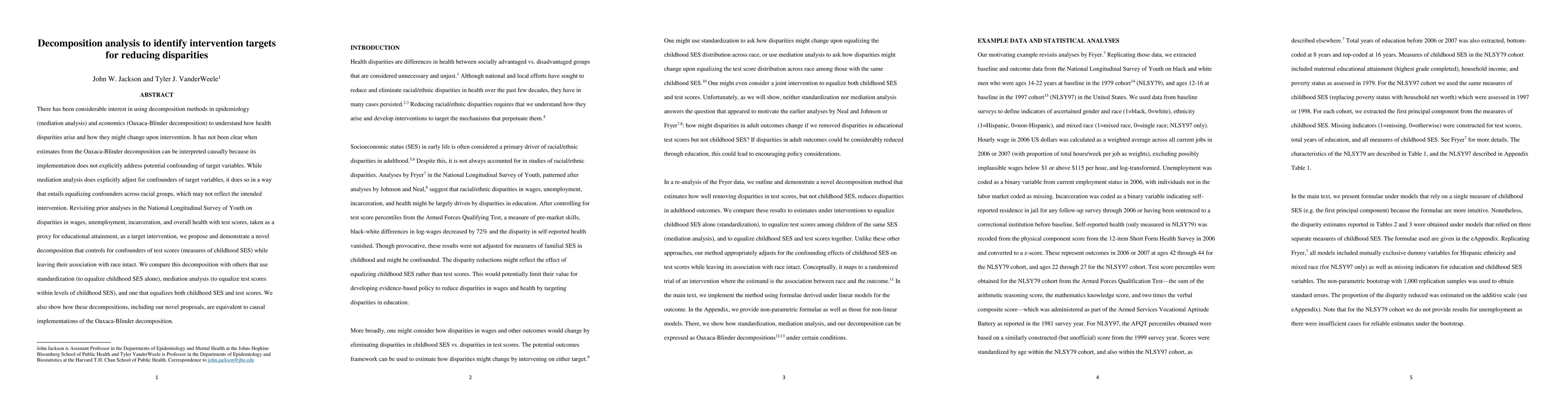 There has been considerable interest in using decomposition methods in epidemiology (mediation analysis) and economics (Oaxaca-Blinder decomposition) to understand how health disparities arise and how they might change upon intervention. It has not been clear when estimates from the Oaxaca-Blinder decomposition can be interpreted causally because its implementation does not explicitly address potential confounding of target variables. While mediation analysis does explicitly adjust for confounders of target variables, it does so in a way that entails equalizing confounders across racial groups, which may not reflect the intended intervention. Revisiting prior analyses in the National Longitudinal Survey of Youth on disparities in wages, unemployment, incarceration, and overall health with test scores, taken as a proxy for educational attainment, as a target intervention, we propose and demonstrate a novel decomposition that controls for confounders of test scores (measures of childhood SES) while leaving their association with race intact. We compare this decomposition with others that use standardization (to equalize childhood SES alone), mediation analysis (to equalize test scores within levels of childhood SES), and one that equalizes both childhood SES and test scores. We also show how these decompositions, including our novel proposals, are equivalent to causal implementations of the Oaxaca-Blinder decomposition.