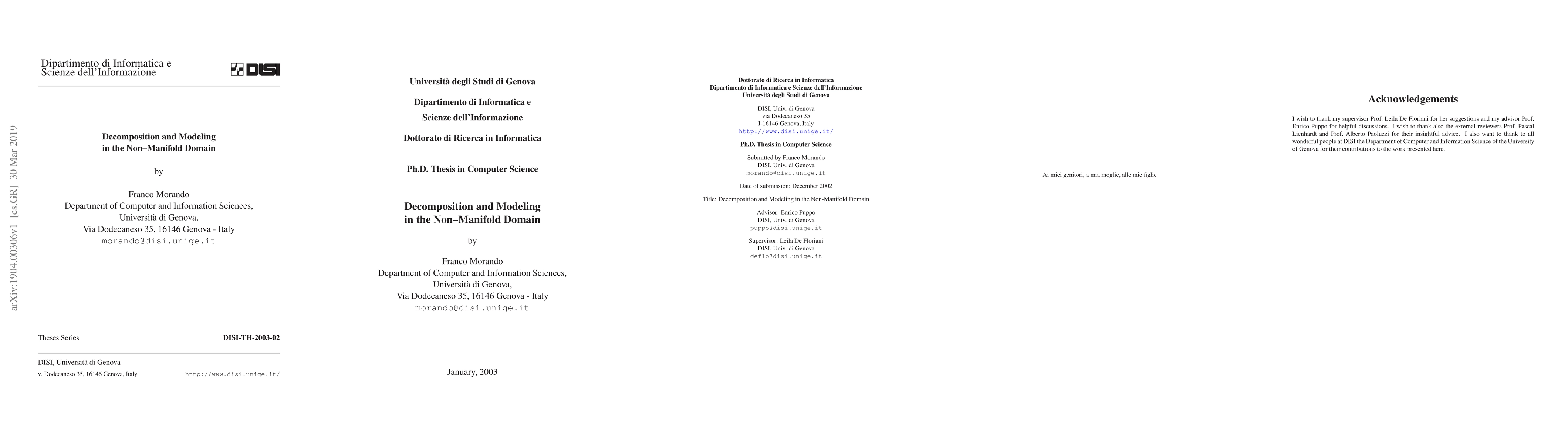 The problem of decomposing non-manifold object has already been studied in solid modeling. However, the few proposed solutions are limited to the problem of decomposing solids described through their boundaries. In this thesis we study the problem of decomposing an arbitrary non-manifold simplicial complex into more regular components. A formal notion of decomposition is developed using combinatorial topology. The proposed decomposition is unique, for a given complex, and is computable for complexes of any dimension. A decomposition algorithm is proposed that is linear w.r.t. the size of the input. In three or higher dimensions a decomposition into manifold parts is not always possible. Thus, in higher dimensions, we decompose a non-manifold into a decidable super class of manifolds, that we call, Initial-Quasi-Manifolds. We also defined a two-layered data structure, the Extended Winged data structure. This data structure is a dimension independent data structure conceived to model non-manifolds through their decomposition into initial-quasi-manifold parts. Our two layered data structure describes the structure of the decomposition and each component separately. In the second layer we encode the connectivity structure of the decomposition. We analyze the space requirements of the Extended Winged data structure and give algorithms to build and navigate it. Finally, we discuss time requirements for the computation of topological relations and show that, for surfaces and tetrahedralizations, embedded in real 3D space, all topological relations can be extracted in optimal time. This approach offers a compact, dimension independent, representation for non-manifolds that can be useful whenever the modeled object has few non-manifold singularities.