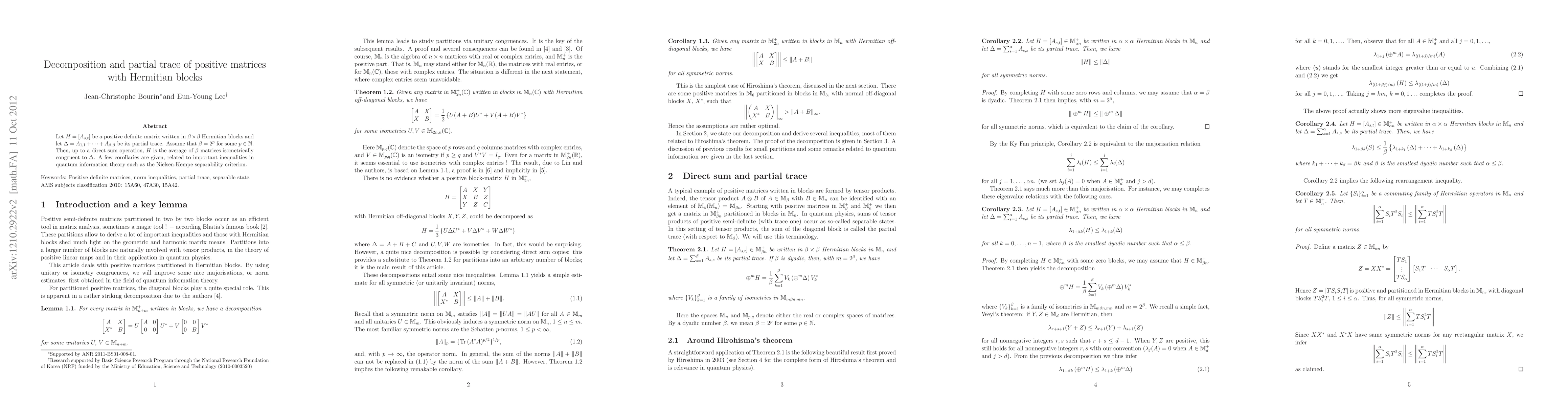 Summary: The paper demonstrates that a positive semidefinite matrix partitioned into Hermitian blocks can be decomposed into an average of matrices isometrically congruent to its partial trace, with implications for quantum information theory, including the Nielsen-Kempe separability criterion.