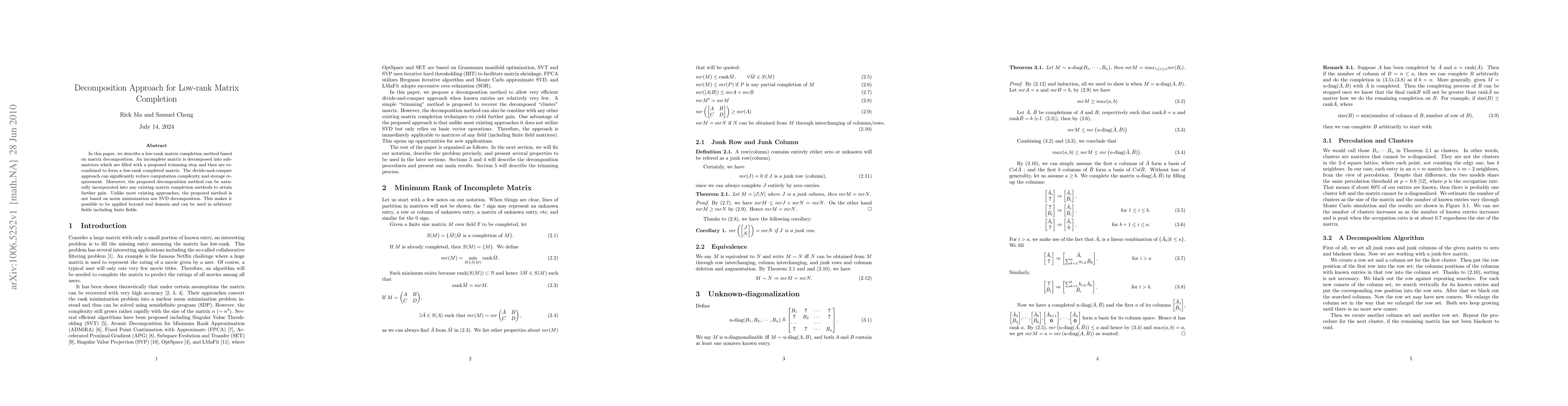In this paper, we describe a low-rank matrix completion method based on matrix decomposition. An incomplete matrix is decomposed into submatrices which are filled with a proposed trimming step and then are recombined to form a low-rank completed matrix. The divide-and-conquer approach can significantly reduce computation complexity and storage requirement. Moreover, the proposed decomposition method can be naturally incorporated into any existing matrix completion methods to attain further gain. Unlike most existing approaches, the proposed method is not based on norm minimization nor SVD decomposition. This makes it possible to be applied beyond real domain and can be used in arbitrary fields including finite fields.