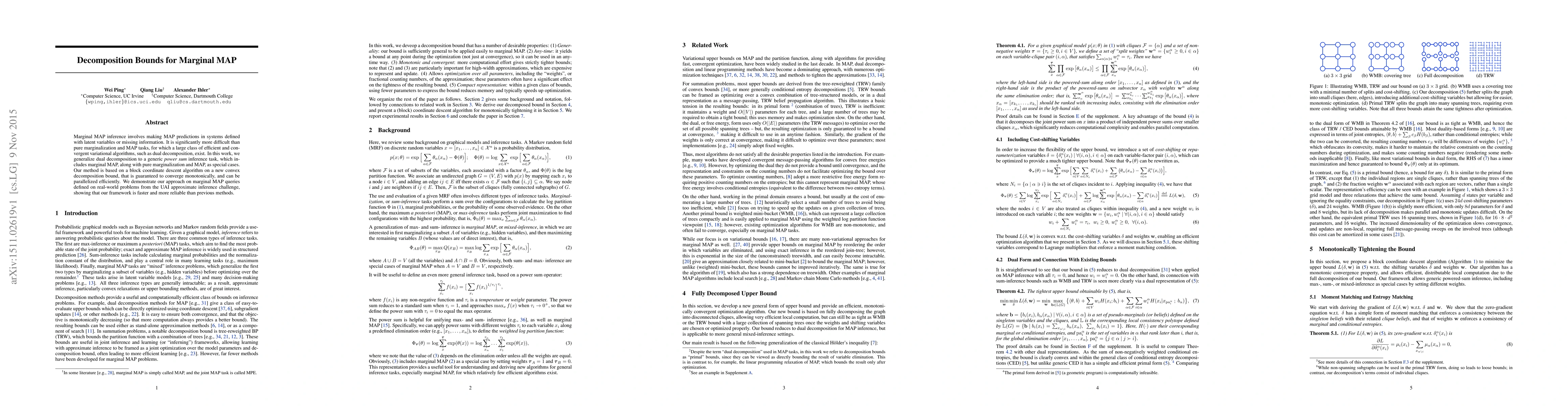 This paper proposes a generalized dual decomposition method for marginal MAP inference, utilizing a block coordinate descent algorithm on a new convex decomposition bound. The method is shown to be faster and more reliable than previous techniques, as demonstrated through real-world problems from the UAI approximate inference challenge.