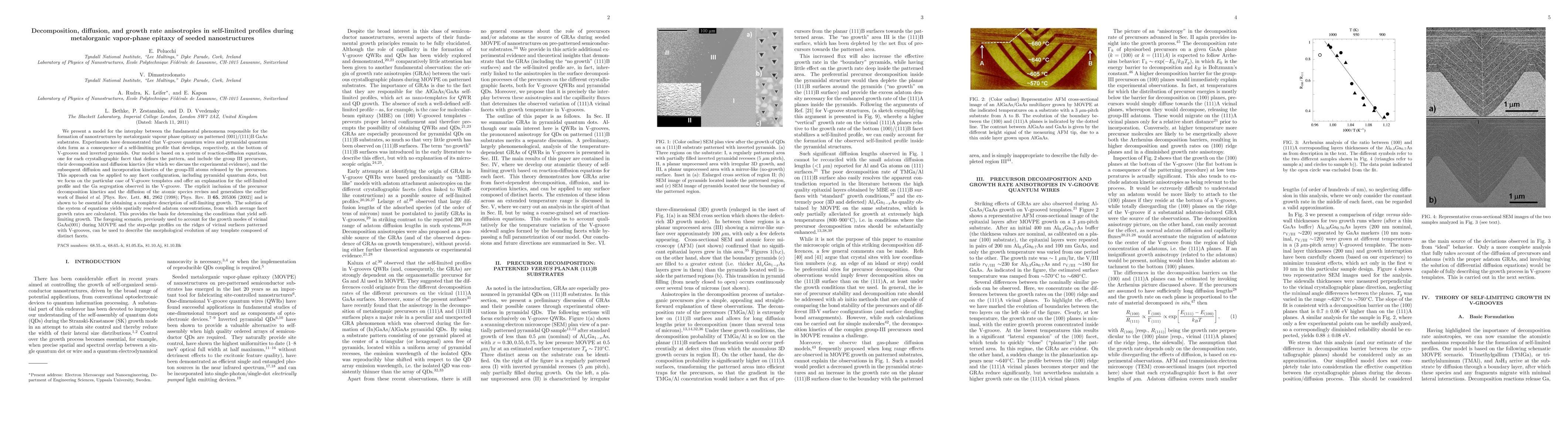 This paper models the formation of nanostructures via metalorganic vapor-phase epitaxy on patterned GaAs substrates, focusing on V-groove quantum wires and pyramidal quantum dots. The study employs reaction-diffusion equations to describe the decomposition and diffusion kinetics of group III precursors, leading to self-limiting growth profiles and Ga segregation.