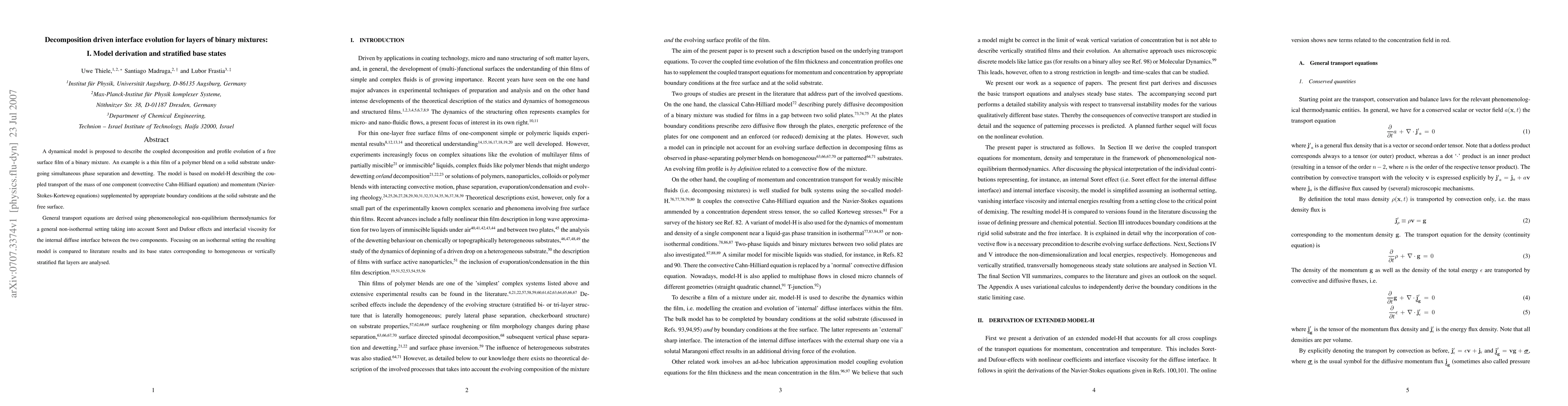 A dynamical model is proposed to describe the coupled decomposition and profile evolution of a free surface film of a binary mixture. An example is a thin film of a polymer blend on a solid substrate undergoing simultaneous phase separation and dewetting. The model is based on model-H describing the coupled transport of the mass of one component (convective Cahn-Hilliard equation) and momentum (Navier-Stokes-Korteweg equations) supplemented by appropriate boundary conditions at the solid substrate and the free surface. General transport equations are derived using phenomenological non-equilibrium thermodynamics for a general non-isothermal setting taking into account Soret and Dufour effects and interfacial viscosity for the internal diffuse interface between the two components. Focusing on an isothermal setting the resulting model is compared to literature results and its base states corresponding to homogeneous or vertically stratified flat layers are analysed.