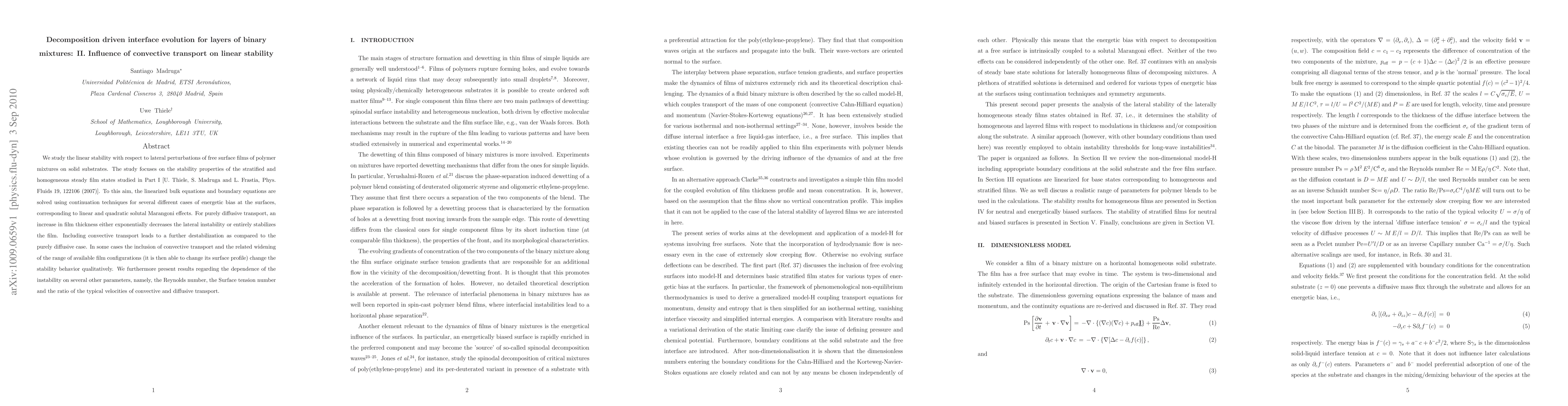 We study the linear stability with respect to lateral perturbations of free surface films of polymer mixtures on solid substrates. The study focuses on the stability properties of the stratified and homogeneous steady film states studied in Part I [U. Thiele, S. Madruga and L. Frastia, Phys. Fluids 19, 122106 (2007)]. To this aim, the linearized bulk equations and boundary equations are solved using continuation techniques for several different cases of energetic bias at the surfaces, corresponding to linear and quadratic solutal Marangoni effects. For purely diffusive transport, an increase in film thickness either exponentially decreases the lateral instability or entirely stabilizes the film. Including convective transport leads to a further destabilization as compared to the purely diffusive case. In some cases the inclusion of convective transport and the related widening of the range of available film configurations (it is then able to change its surface profile) change the stability behavior qualitatively. We furthermore present results regarding the dependence of the instability on several other parameters, namely, the Reynolds number, the Surface tension number and the ratio of the typical velocities of convective and diffusive transport.