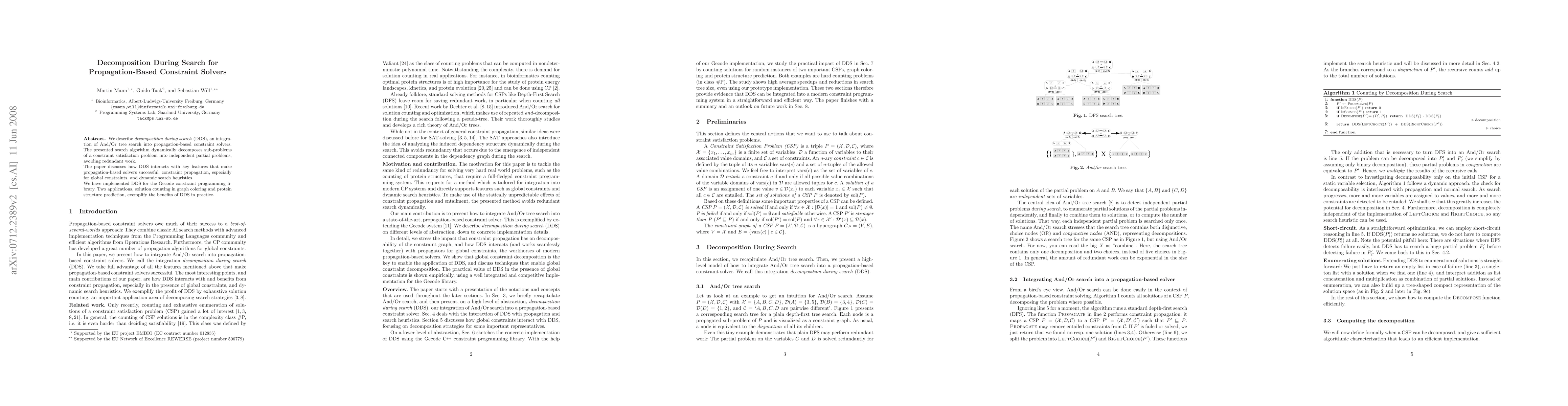 Decomposition During Search for Propagation-Based Constraint Solvers introduces a new algorithm that combines And/Or tree search with propagation-based constraint solvers to improve efficiency, reducing redundant work in solving complex problems.