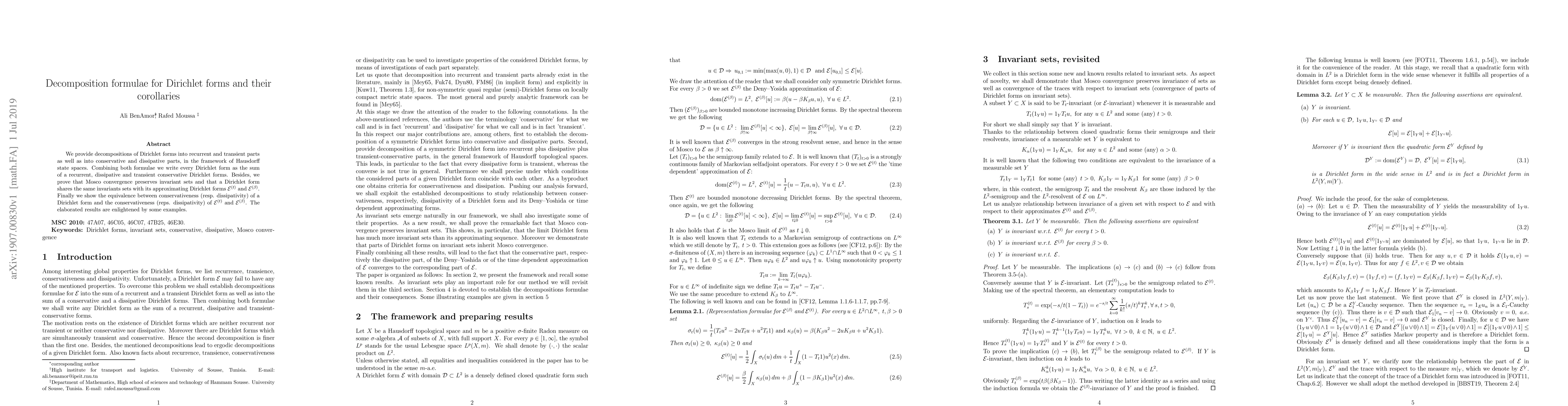 We provide decompositions of Dirichlet forms into recurrent and transient parts as well as into conservative and dissipative parts, in the framework of Hausdorff state spaces. Combining both formulae we write every Dirichlet form as the sum of a recurrent, dissipative and transient conservative Dirichlet forms. Besides, we prove that Mosco convergence preserves invariant sets and that a Dirichlet form shares the same invariants sets with its approximating Dirichlet forms E(t) and E(?). Finally we show the equivalence between conservativeness (resp. dissipativity) of a Dirichlet form and the conservativeness (reps. dissipativity) of E(t) and E(?). The elaborated results are enlightened by some examples.