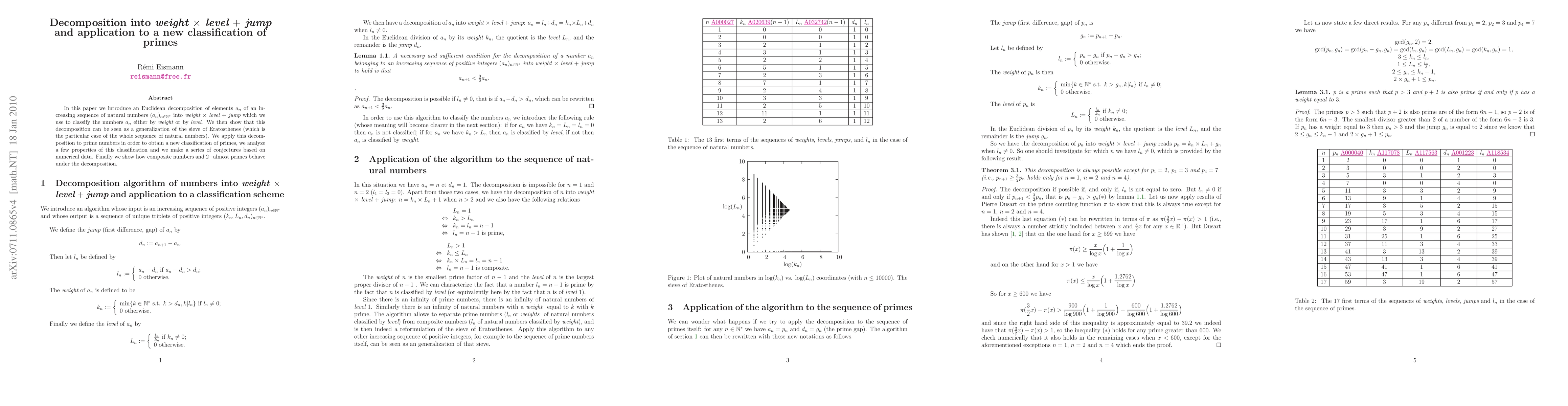 In this paper we introduce an Euclidean decomposition of elements a_n of an increasing sequence of natural numbers into weight * level + jump which we use to classify the numbers a_n either by weight or by level. We then show that this decomposition can be seen as a generalization of the sieve of Eratosthenes (which is the particular case of the whole sequence of natural numbers). We apply this decomposition to prime numbers in order to obtain a new classification of primes, we analyze a few properties of this classification and we make a series of conjectures based on numerical data. Finally we show how composite numbers and 2-almost primes behave under the decomposition.