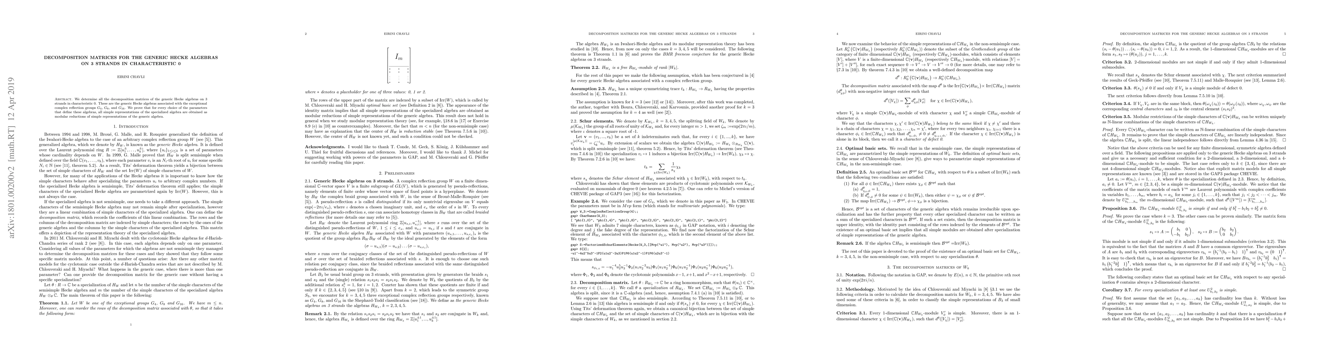 We classify all the decomposition matrices of the generic Hecke algebras on 3 strands in characteristic 0. These are the generic Hecke algebras associated to the exceptional complex reflection groups $G_4$, $G_8$ and $G_{16}$. We prove that for every choice of the parameters that define these algebras, all ordinary representations are obtained as modular reductions of irreducible representations.