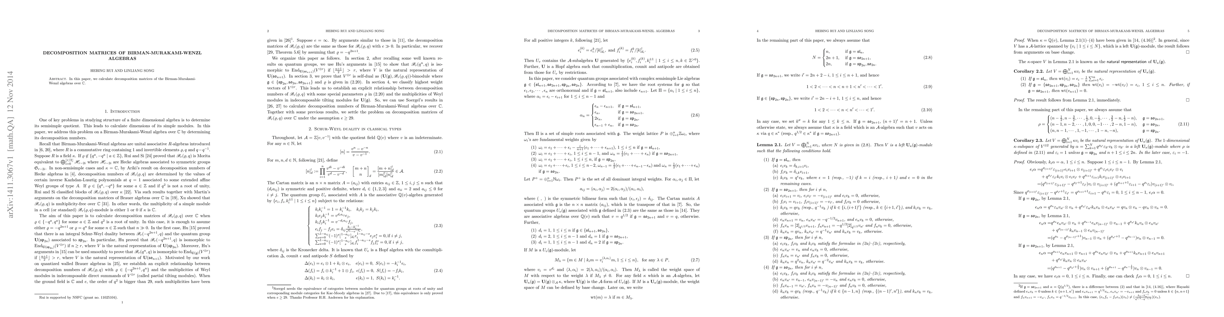 This paper calculates decomposition matrices for Birman-Murakami-Wenzl algebras over the complex field $\mathbb{C}$, contributing to the understanding of their structure and representation theory.