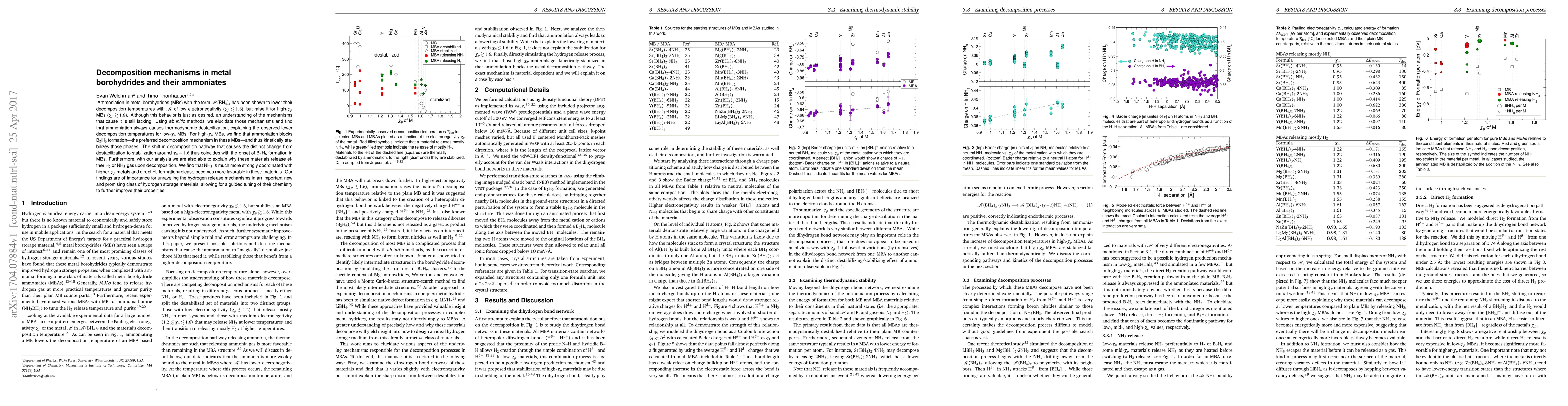 This paper uses \emph{ab initio} methods to investigate the decomposition mechanisms in metal borohydrides and their ammoniates, revealing that ammoniation causes thermodynamic destabilization in low-electronegativity metals but blocks B$_2$H$_6$ formation to kinetically stabilize high-electronegativity metals. The study also explains the release of H$_2$ or NH$_3$ gas upon decomposition, highlighting the coordination of NH$_3$ with higher-$\chi_p$ metals.