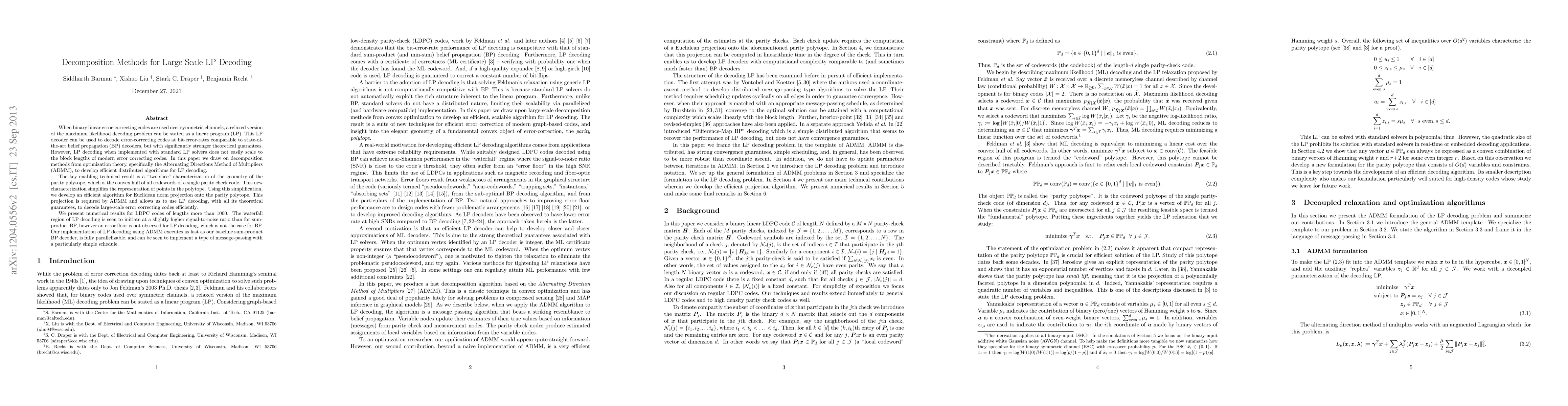 This paper proposes a decomposition method using the Alternating Directions Method of Multipliers (ADMM) to efficiently scale large-scale linear programming (LP) decoding for binary linear error-correcting codes. It introduces a "two-slice" characterization of the parity polytope to simplify representation and develop an efficient projection algorithm, enabling fast, parallelizable LP decoding that matches the performance of belief propagation decoders without an error floor.