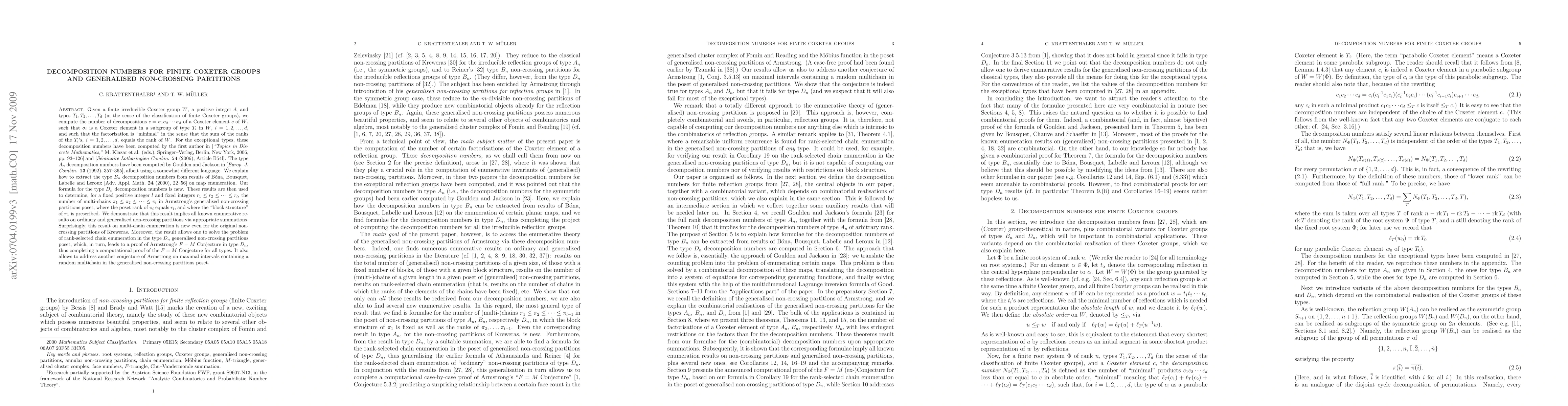 Given a finite irreducible Coxeter group $W$, a positive integer $d$, and types $T_1,T_2,...,T_d$ (in the sense of the classification of finite Coxeter groups), we compute the number of decompositions $c=\si_1\si_2 cdots\si_d$ of a Coxeter element $c$ of $W$, such that $\si_i$ is a Coxeter element in a subgroup of type $T_i$ in $W$, $i=1,2,...,d$, and such that the factorisation is "minimal" in the sense that the sum of the ranks of the $T_i$'s, $i=1,2,...,d$, equals the rank of $W$. For the exceptional types, these decomposition numbers have been computed by the first author. The type $A_n$ decomposition numbers have been computed by Goulden and Jackson, albeit using a somewhat different language. We explain how to extract the type $B_n$ decomposition numbers from results of B\'ona, Bousquet, Labelle and Leroux on map enumeration. Our formula for the type $D_n$ decomposition numbers is new. These results are then used to determine, for a fixed positive integer $l$ and fixed integers $r_1\le r_2\le ...\le r_l$, the number of multi-chains $\pi_1\le \pi_2\le ...\le \pi_l$ in Armstrong's generalised non-crossing partitions poset, where the poset rank of $\pi_i$ equals $r_i$, and where the "block structure" of $\pi_1$ is prescribed. We demonstrate that this result implies all known enumerative results on ordinary and generalised non-crossing partitions via appropriate summations. Surprisingly, this result on multi-chain enumeration is new even for the original non-crossing partitions of Kreweras. Moreover, the result allows one to solve the problem of rank-selected chain enumeration in the type $D_n$ generalised non-crossing partitions poset, which, in turn, leads to a proof of Armstrong's $F=M$ Conjecture in type $D_n$.