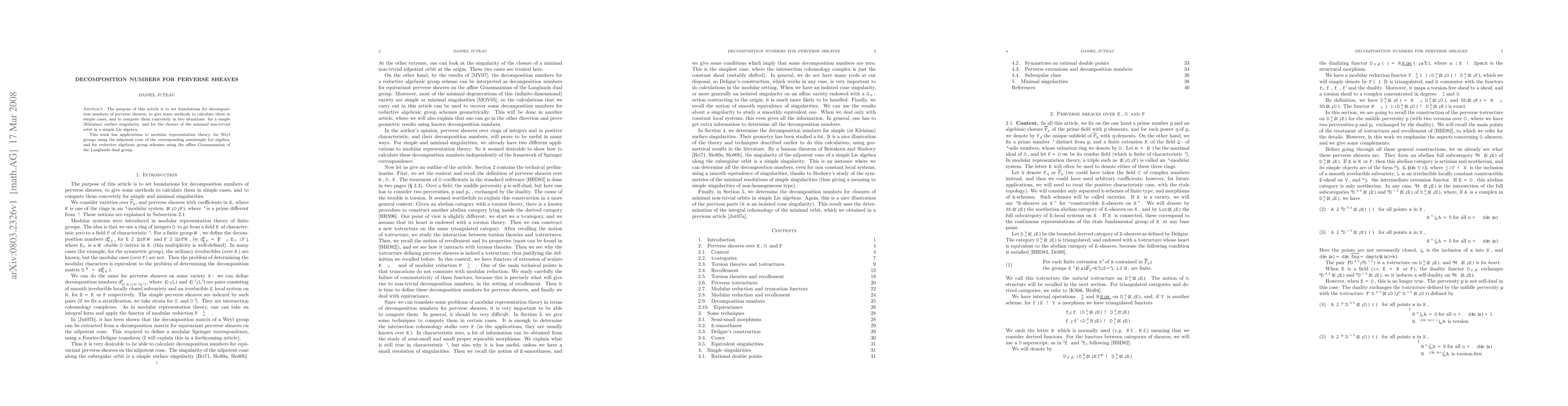 The purpose of this article is to set foundations for decomposition numbers of perverse sheaves, to give some methods to calculate them in simple cases, and to compute them concretely in two situations: for a simple (Kleinian) surface singularity, and for the closure of the minimal non-trivial orbit in a simple Lie algebra. This work has applications to modular representation theory, for Weyl groups using the nilpotent cone of the corresponding semisimple Lie algebra, and for reductive algebraic group schemes using the affine Grassmannian of the Langlands dual group.