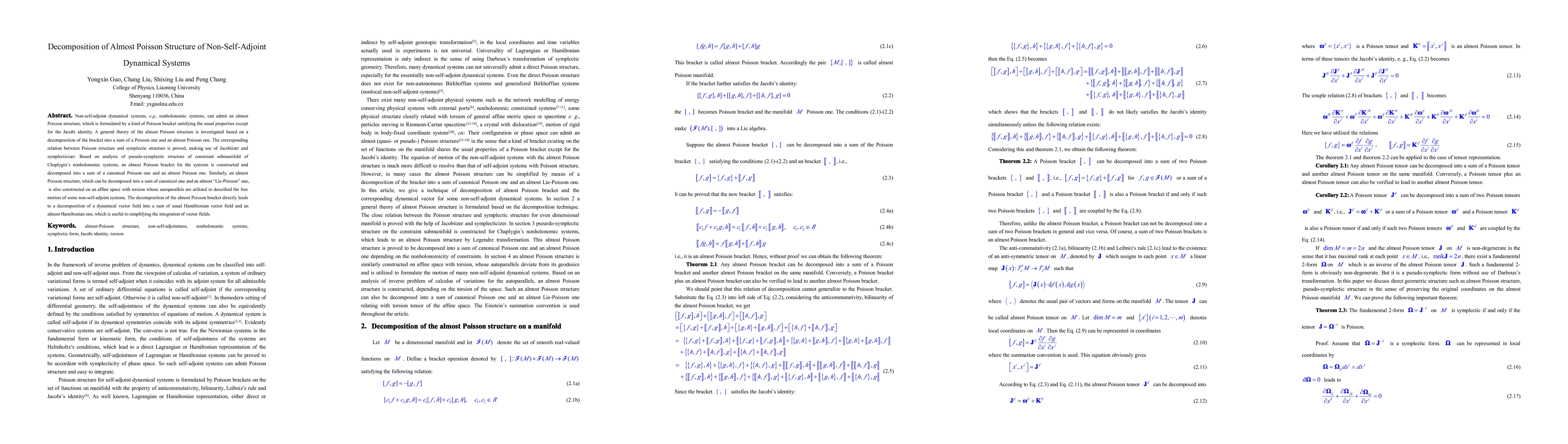 This paper investigates the decomposition of almost Poisson structures in non-self-adjoint dynamical systems, proposing a method to decompose these structures into canonical Poisson and almost Poisson components. The analysis of pseudo-symplectic structures in Chaplygin nonholonomic systems leads to the construction of an almost Poisson bracket decomposed into Hamiltonian and almost Hamiltonian parts, aiding in the integration of vector fields.