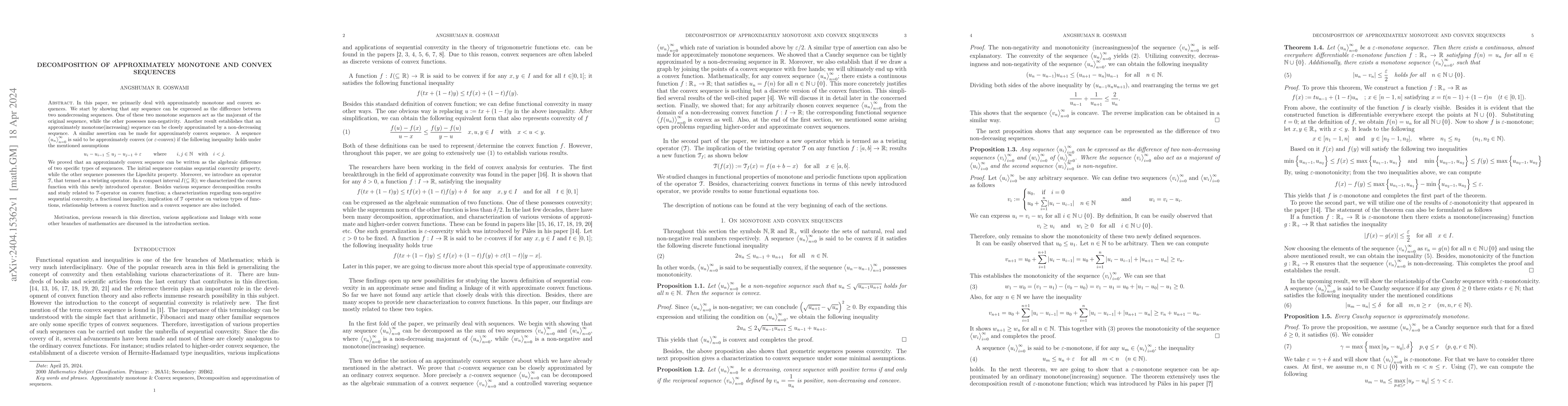 This paper explores the decomposition of approximately monotone and convex sequences, demonstrating that any sequence can be expressed as the difference between two nondecreasing sequences, with one serving as a majorant and the other non-negative. It also proves that approximately monotone and convex sequences can be closely approximated by non-decreasing sequences and introduces a "twisting operator" to characterize convex functions within a compact interval.