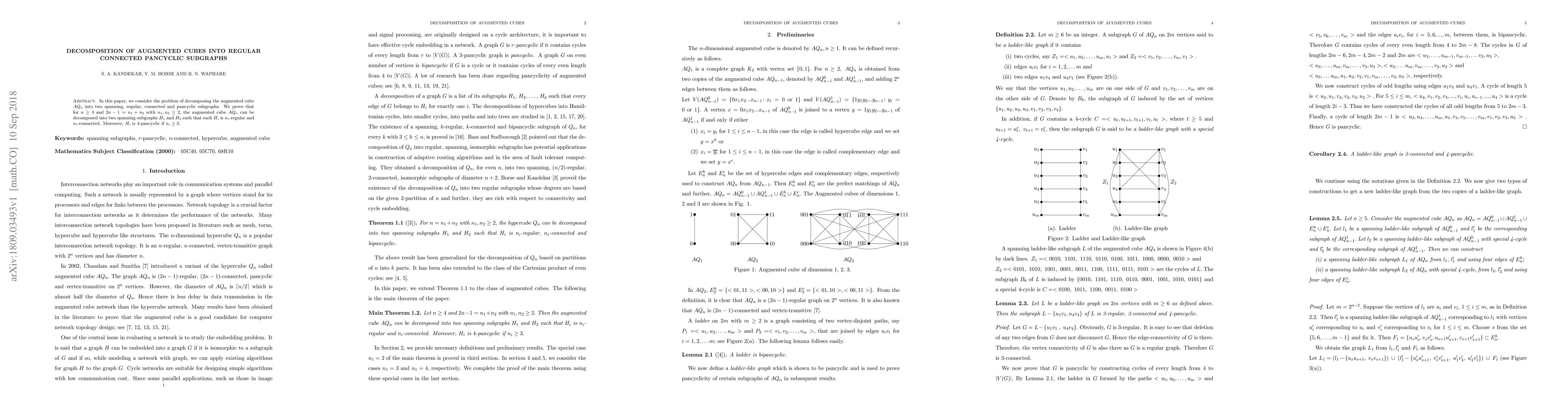 In this paper, we consider the problem of decomposing the augmented cube $AQ_n$ into two spanning, regular, connected and pancyclic subgraphs. We prove that for $ n \geq 4$ and $ 2n - 1 = n_1 + n_2 $ with $ n_1, n_2 \geq 2,$ the augmented cube $ AQ_n$ can be decomposed into two spanning subgraphs $ H_1$ and $ H_2$ such that each $ H_i$ is $n_i$-regular and $n_i$-connected. Moreover, $H_i$ is $4$-pancyclic if $ n_i \geq 3.$