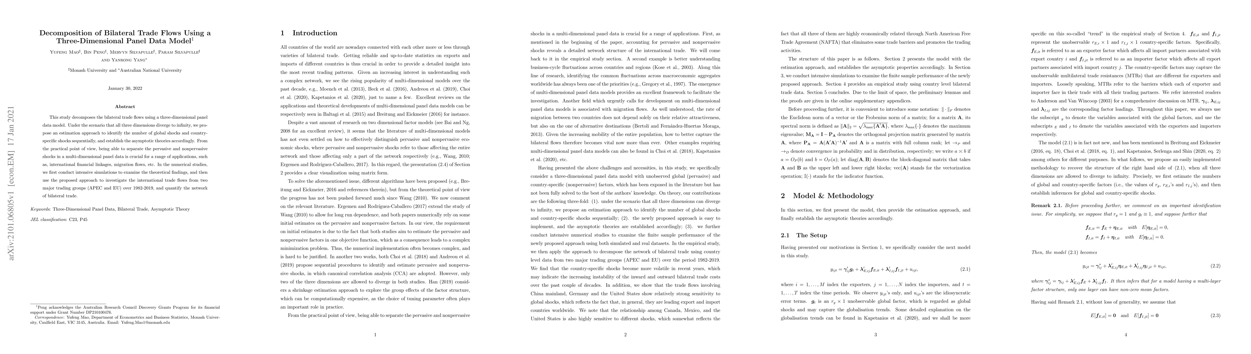 This study decomposes the bilateral trade flows using a three-dimensional panel data model. Under the scenario that all three dimensions diverge to infinity, we propose an estimation approach to identify the number of global shocks and country-specific shocks sequentially, and establish the asymptotic theories accordingly. From the practical point of view, being able to separate the pervasive and nonpervasive shocks in a multi-dimensional panel data is crucial for a range of applications, such as, international financial linkages, migration flows, etc. In the numerical studies, we first conduct intensive simulations to examine the theoretical findings, and then use the proposed approach to investigate the international trade flows from two major trading groups (APEC and EU) over 1982-2019, and quantify the network of bilateral trade.