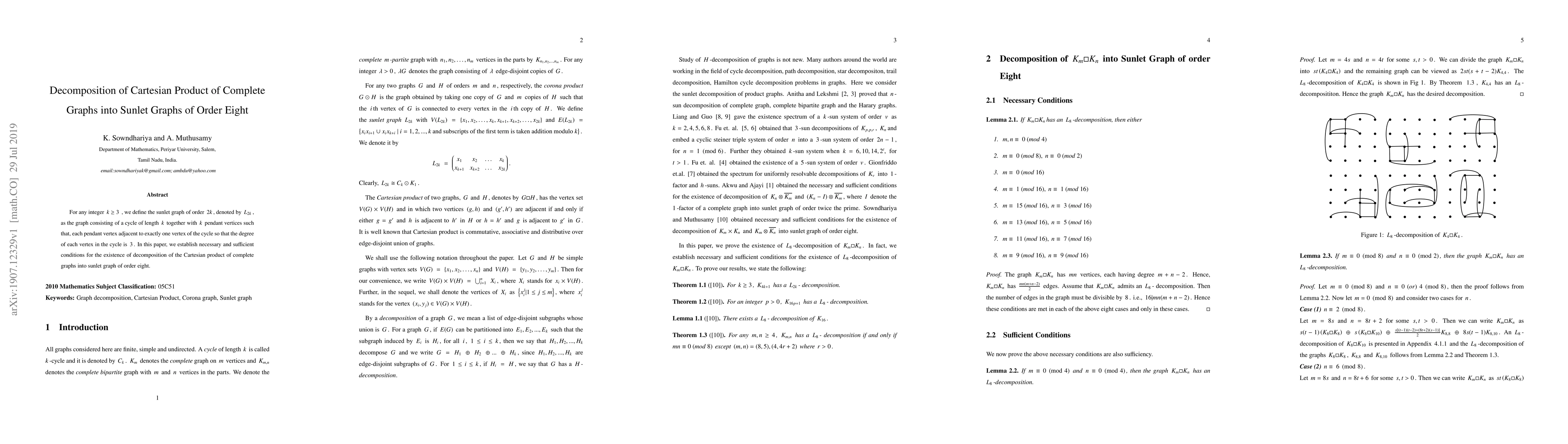 we define the sunlet graph is the graph obtained by taking one copy of the cycle and joined every vertex of the cycle to an exactly one pendant vertex such that the degree of each vertex in the cycle is three. In this paper, we establish necessary and sufficient conditions for the existence of decomposition of the Cartesian product of complete graphs into sunlet graph of order eight.