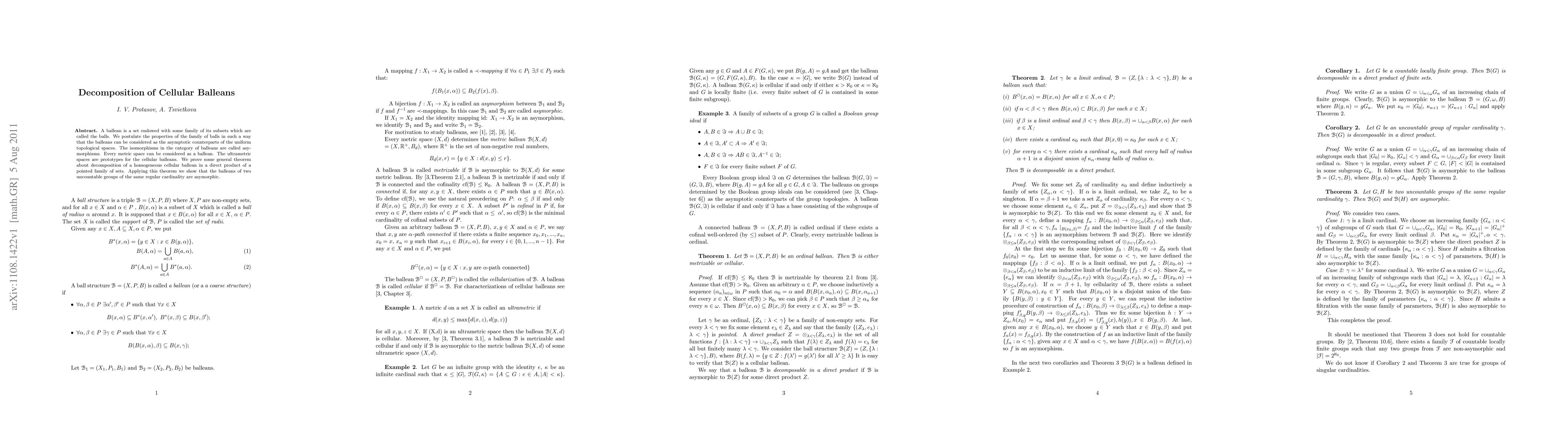 A ballean is a set endowed with some family of its subsets which are called the balls. We postulate the properties of the family of balls in such a way that the balleans can be considered as the asymptotic counterparts of the uniform topological spaces. The isomorphisms in the category of balleans are called asymorphisms. Every metric space can be considered as a ballean. The ultrametric spaces are prototypes for the cellular balleans. We prove some general theorem about decomposition of a homogeneous cellular ballean in a direct product of a pointed family of sets. Applying this theorem we show that the balleans of two uncountable groups of the same regular cardinality are asymorphic.