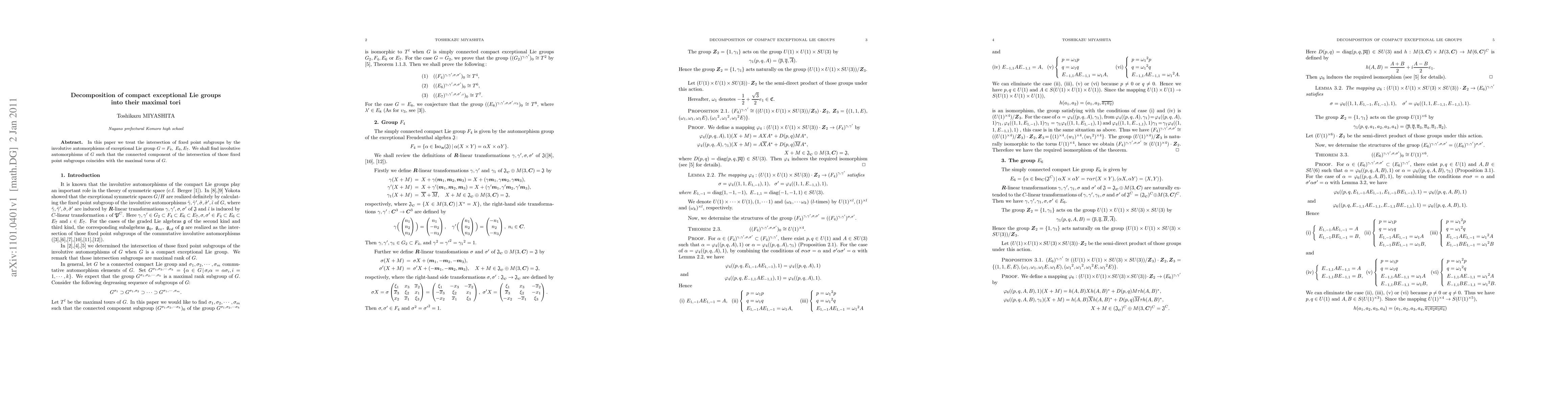 This paper investigates the decomposition of exceptional Lie groups $F_4$, $E_6$, and $E_7$ into their maximal tori through the analysis of fixed point subgroups under involutive automorphisms, showing that the intersection of these subgroups aligns with the group's maximal torus.