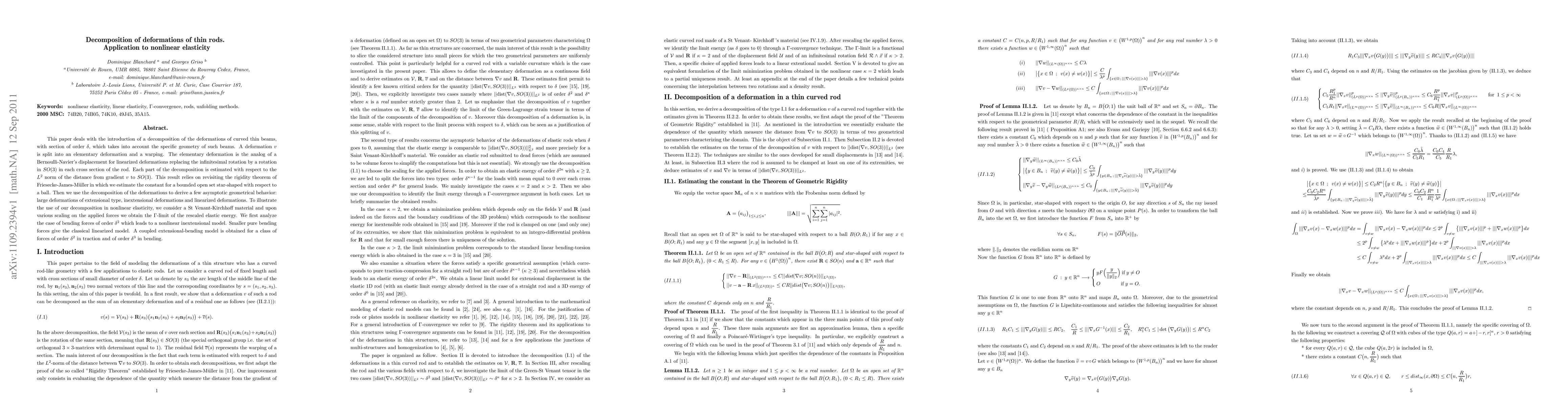 This paper introduces a decomposition of deformations for thin curved beams, splitting them into elementary deformations and warping, and applies this to nonlinear elasticity. The decomposition is analyzed using the $L^2$ norm and the Friesecke-James-Müller rigidity theorem, leading to insights on large deformations and the $\Gamma$-limit of elastic energy for St Venant-Kirchhoff materials under various force scalings.